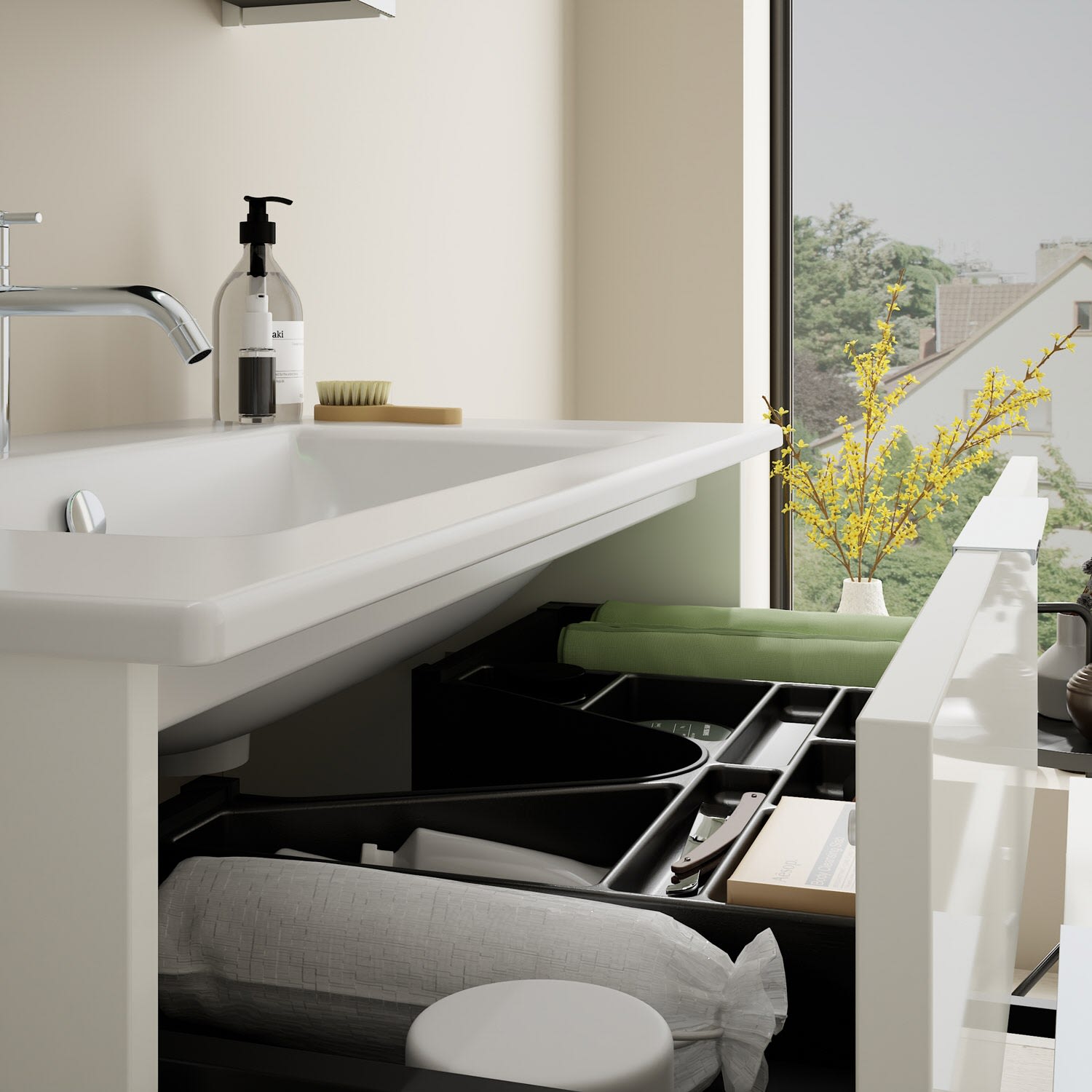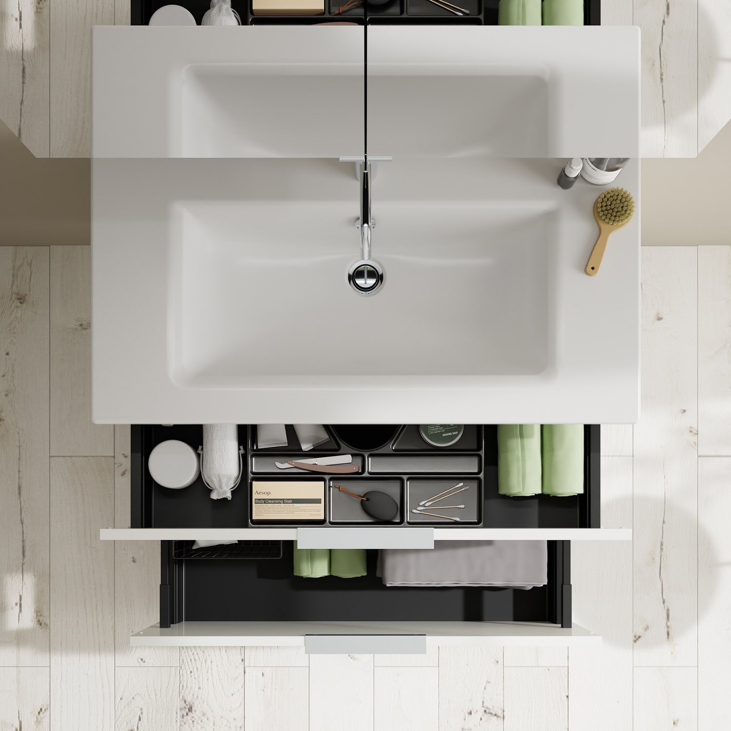 - 1 Schublade oben, 35 cm tief, mit Siphonausschnitt und Inneneinteilung