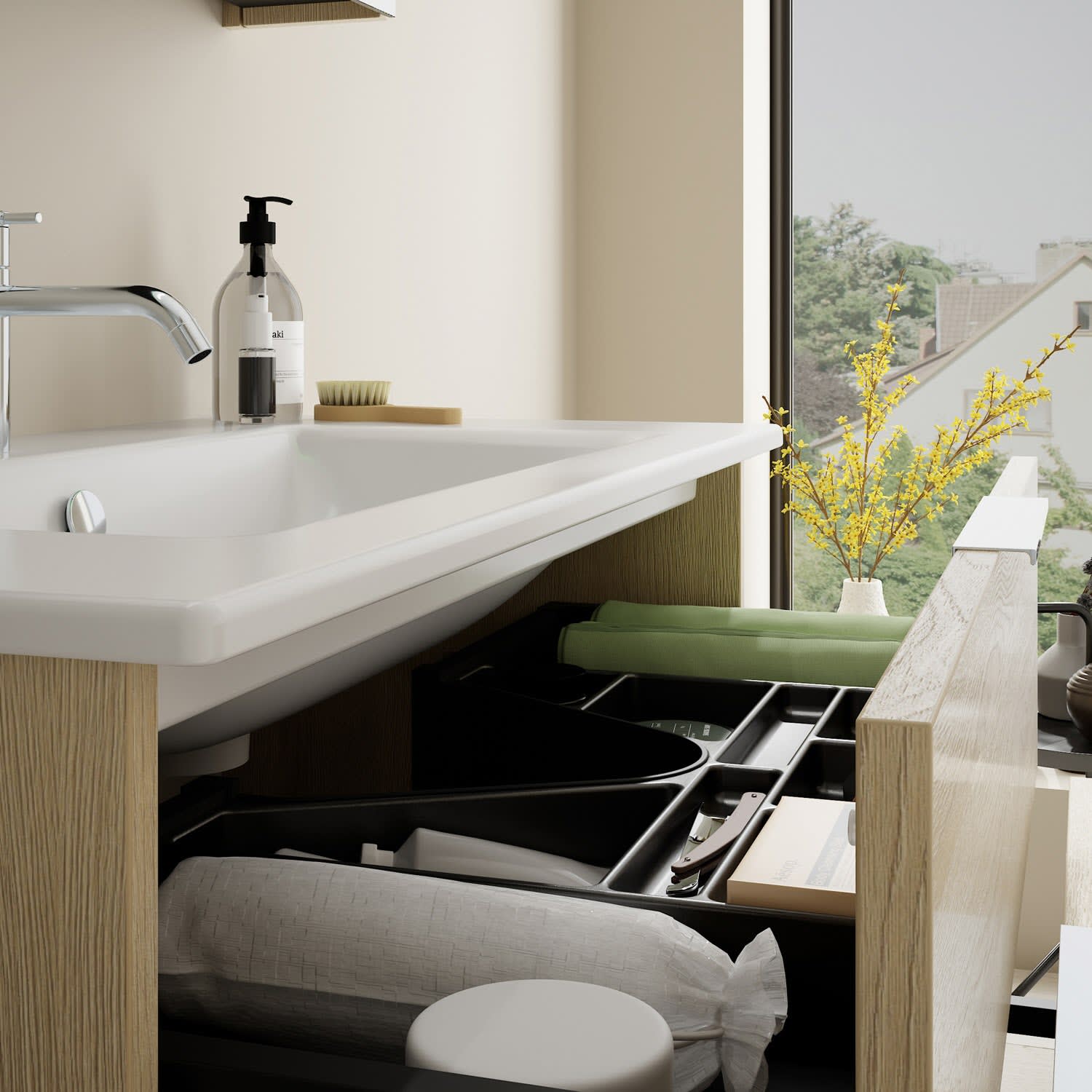 - 1 Schublade oben, 35 cm tief, mit Siphonausschnitt und Inneneinteilung