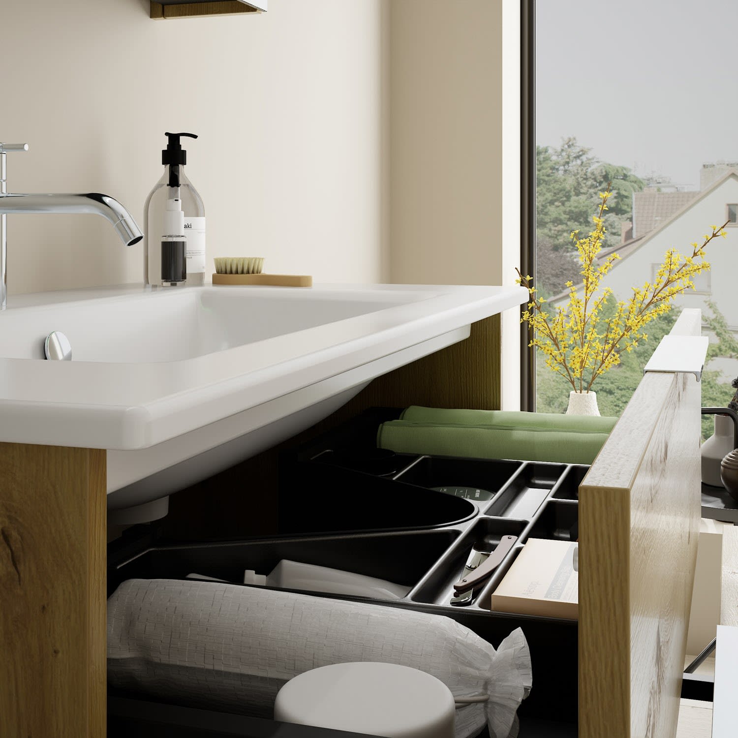 - 1 Schublade oben, 35 cm tief, mit Siphonausschnitt und Inneneinteilung