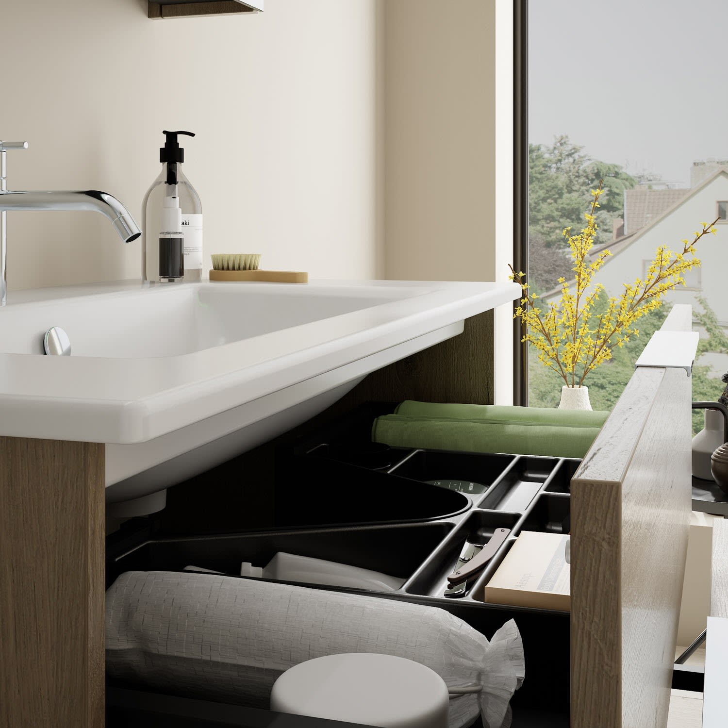 - 1 Schublade oben, 35 cm tief, mit Siphonausschnitt und Inneneinteilung