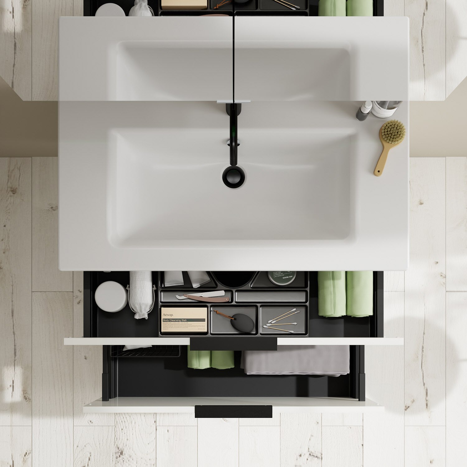 - 1 Schublade oben, 35 cm tief, mit Siphonausschnitt und Inneneinteilung