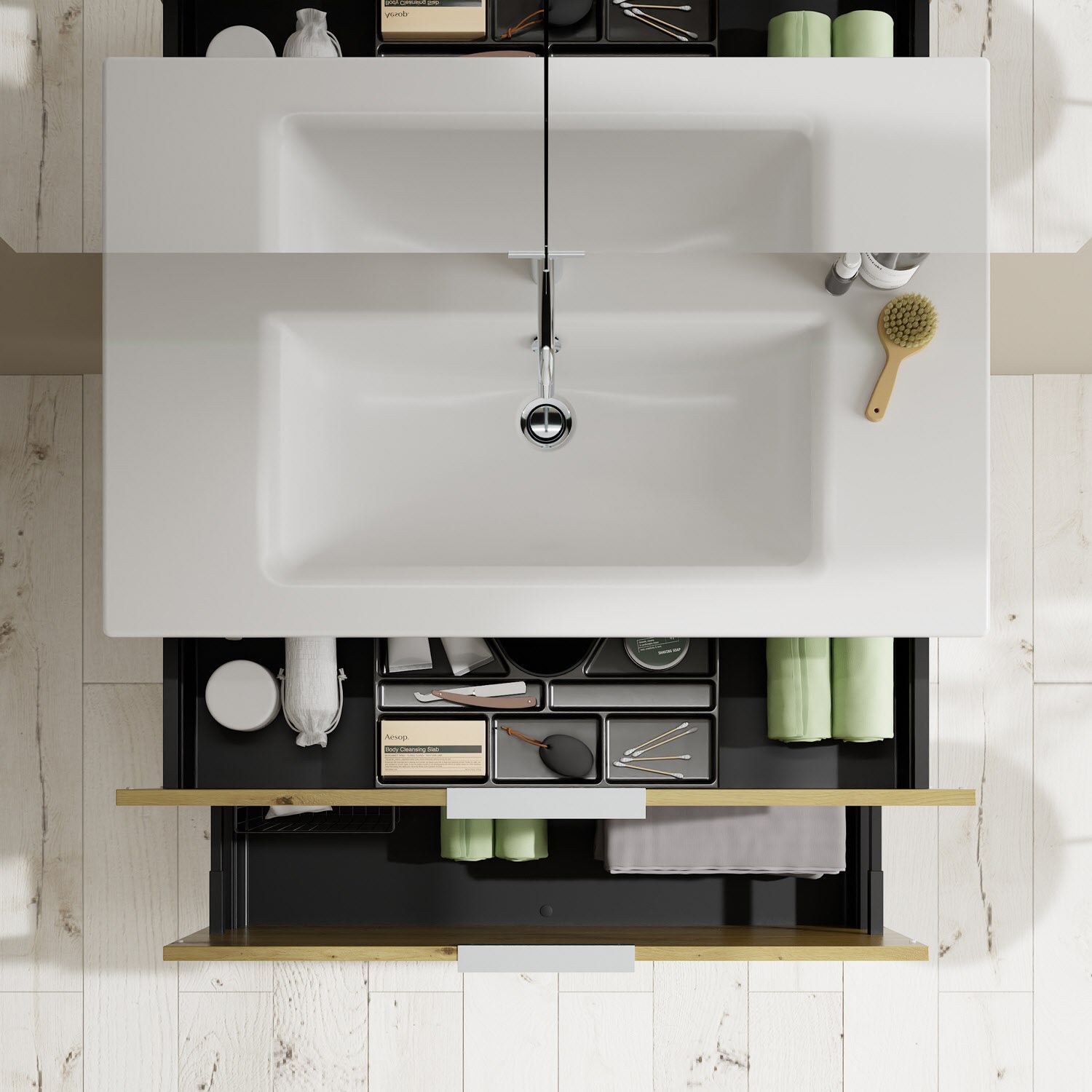 - 1 Schublade oben, 35 cm tief, mit Siphonausschnitt und Inneneinteilung