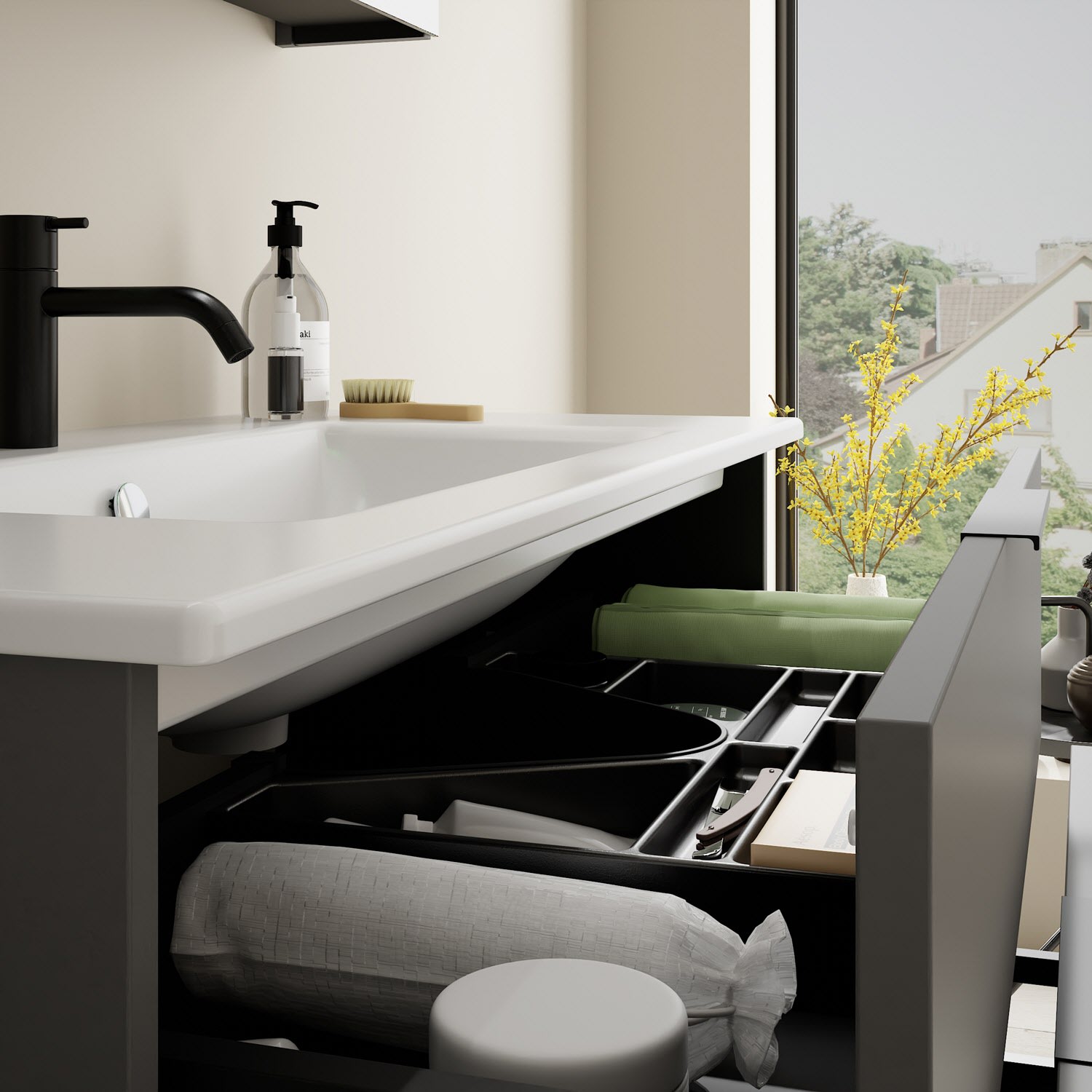 - 1 Schublade oben, 35 cm tief, mit Siphonausschnitt und Inneneinteilung