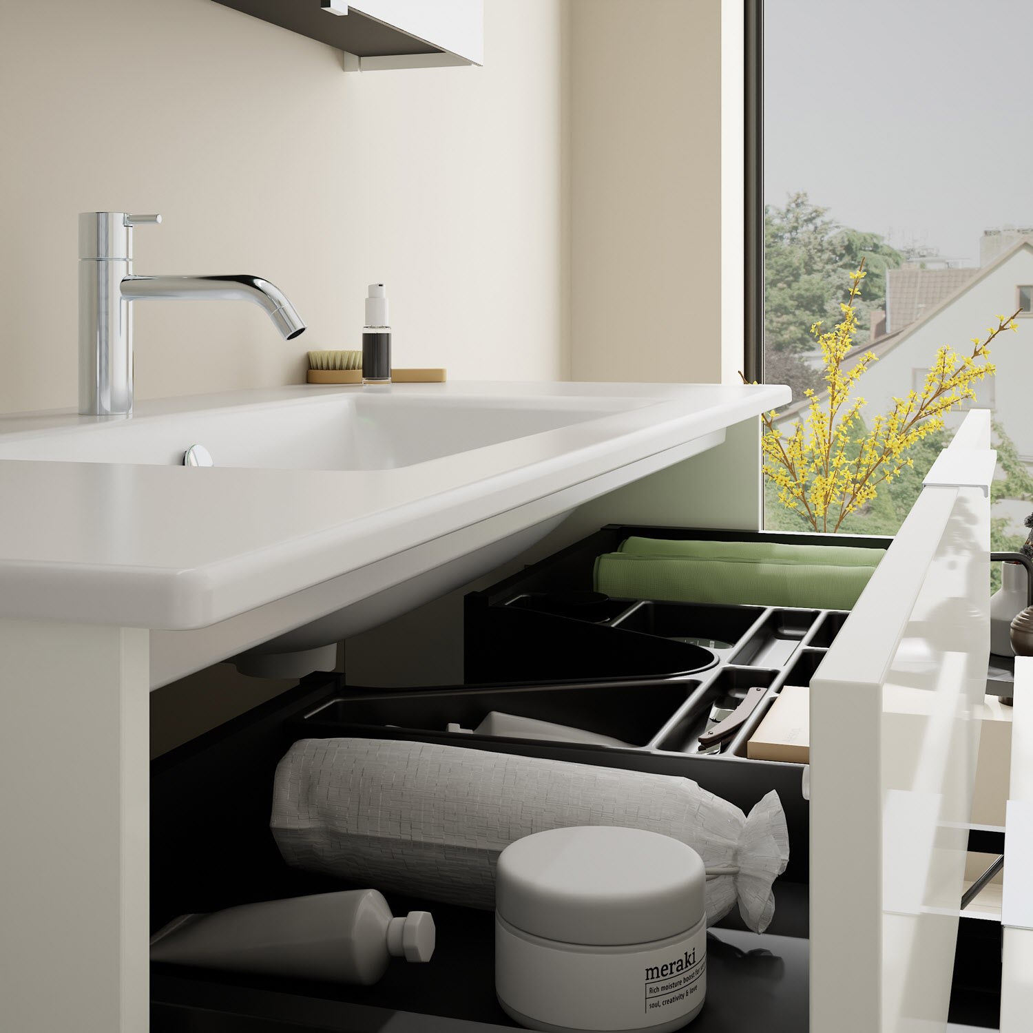 - 1 Schublade oben, 35 cm tief, mit Siphonausschnitt und Inneneinteilung