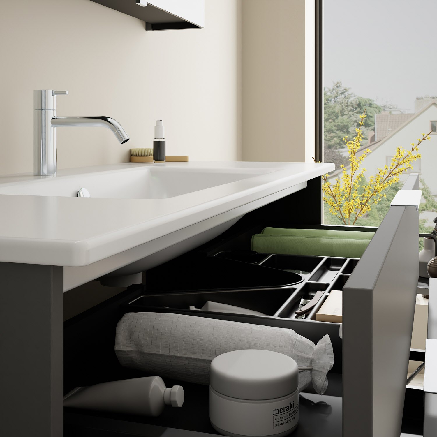 - 1 Schublade oben, 35 cm tief, mit Siphonausschnitt und Inneneinteilung