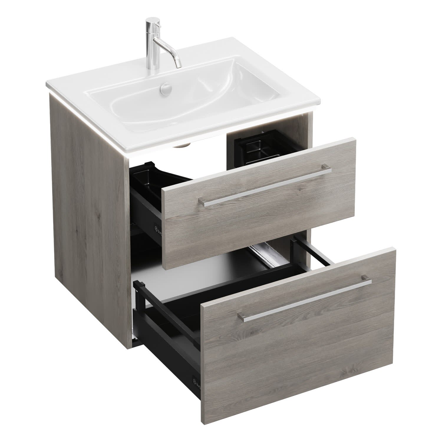 - 1 Schublade oben, 35 cm tief, mit Siphonausschnitt und Inneneinteilung