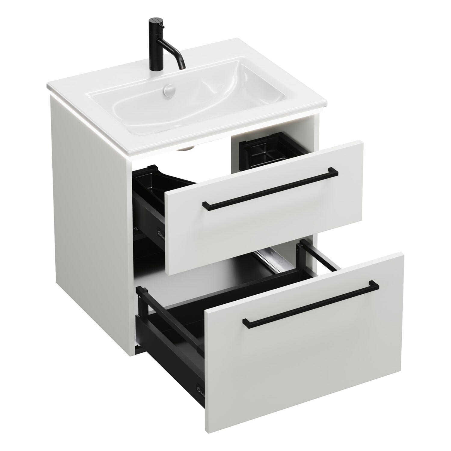 - 1 Schublade oben, 35 cm tief, mit Siphonausschnitt und Inneneinteilung