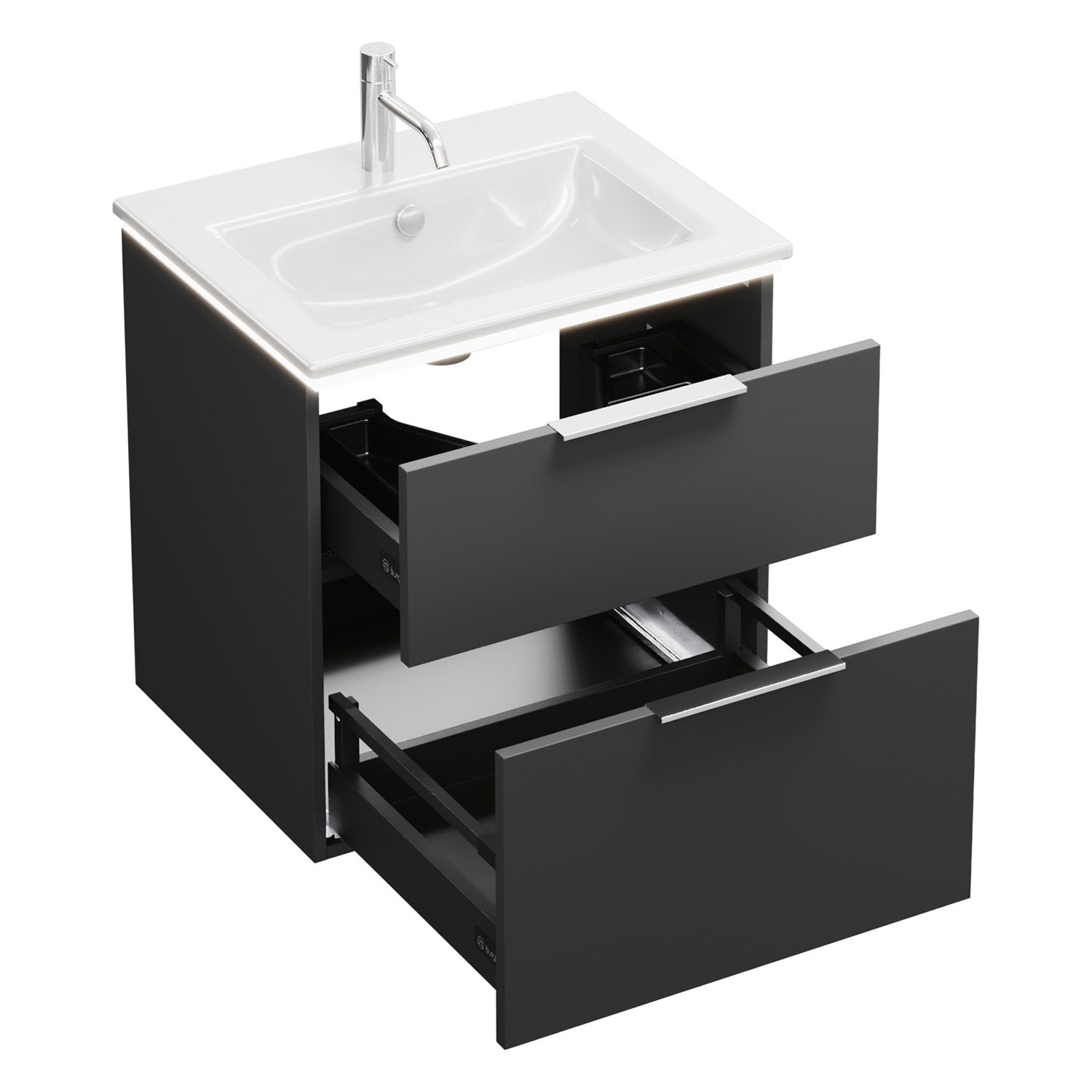 - 1 Schublade oben, 35 cm tief, mit Siphonausschnitt und Inneneinteilung