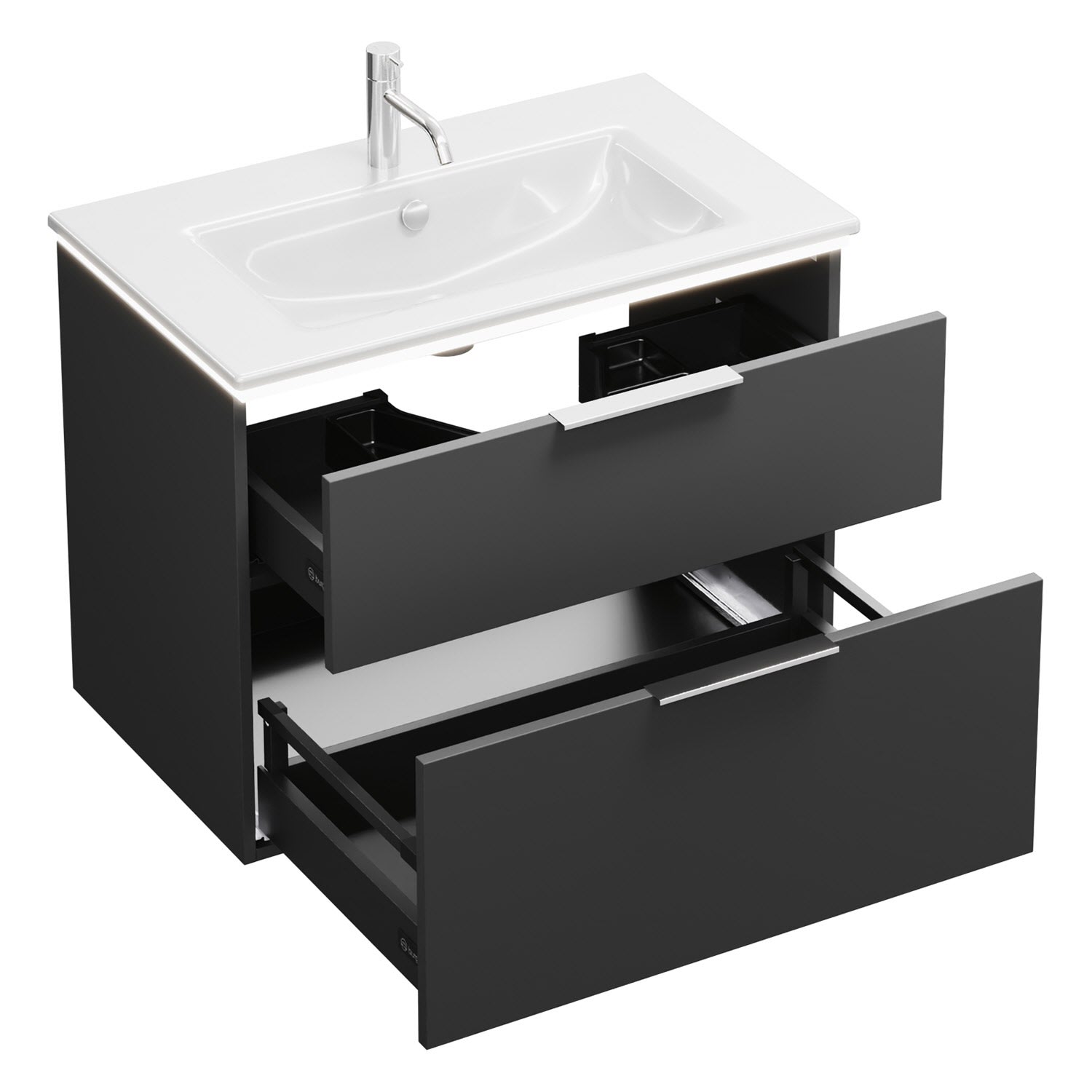 - 1 Schublade oben, 35 cm tief, mit Siphonausschnitt und Inneneinteilung