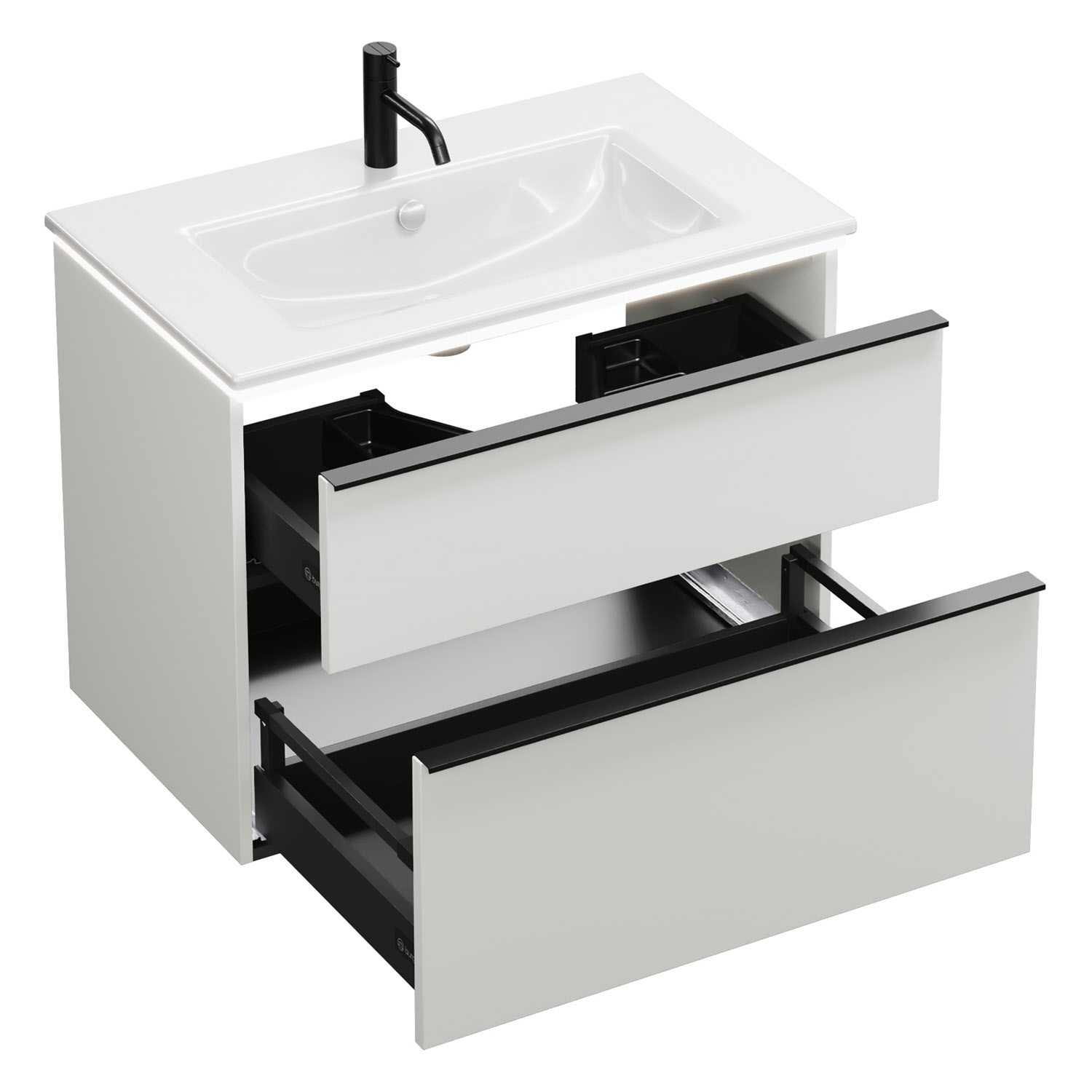 - 1 Schublade oben, 35 cm tief, mit Siphonausschnitt und Inneneinteilung
