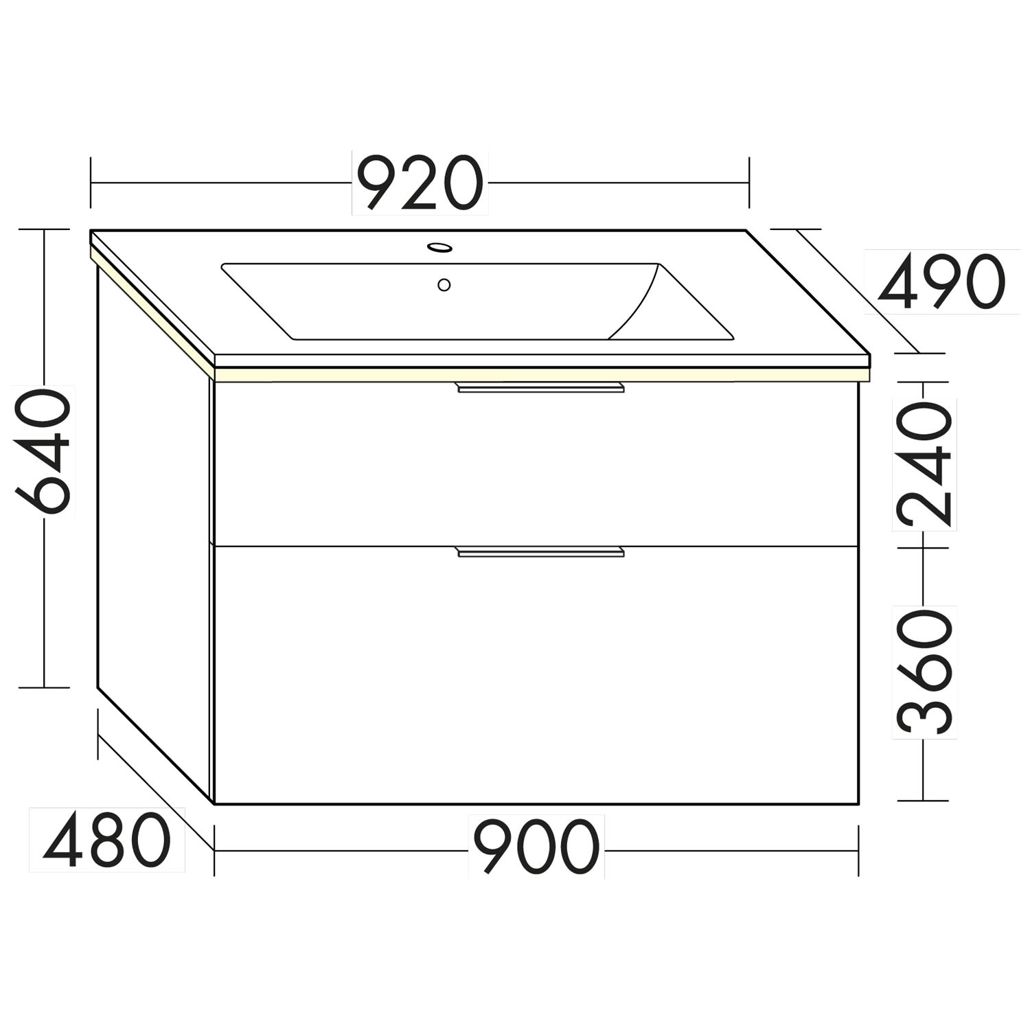 - 1 Schublade oben, 35 cm tief, mit Siphonausschnitt und Inneneinteilung