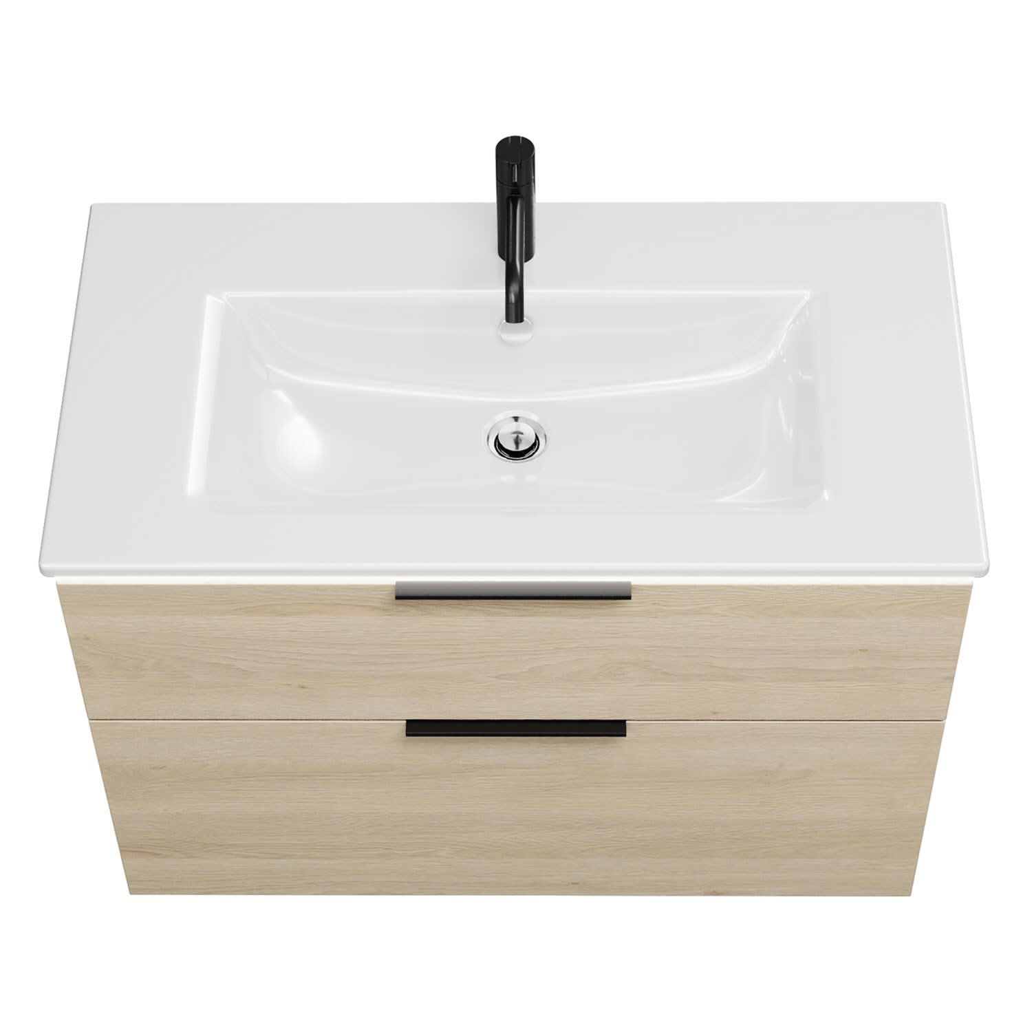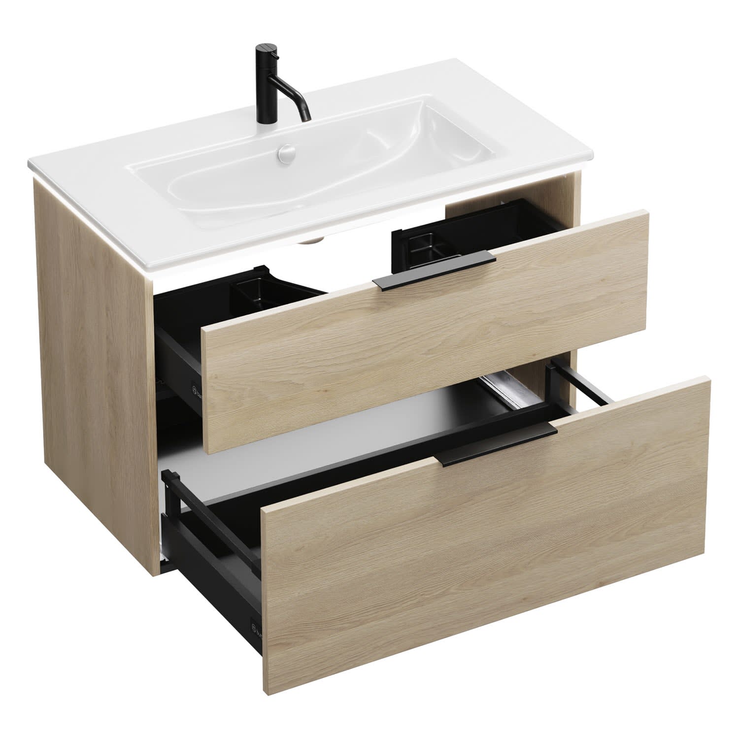 - 1 Schublade oben, 35 cm tief, mit Siphonausschnitt und Inneneinteilung