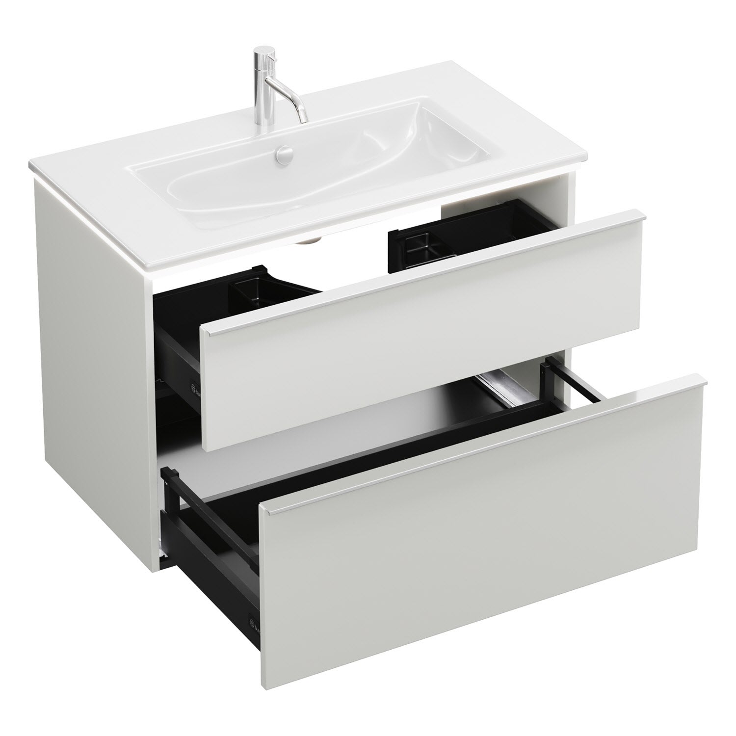 - 1 Schublade oben, 35 cm tief, mit Siphonausschnitt und Inneneinteilung