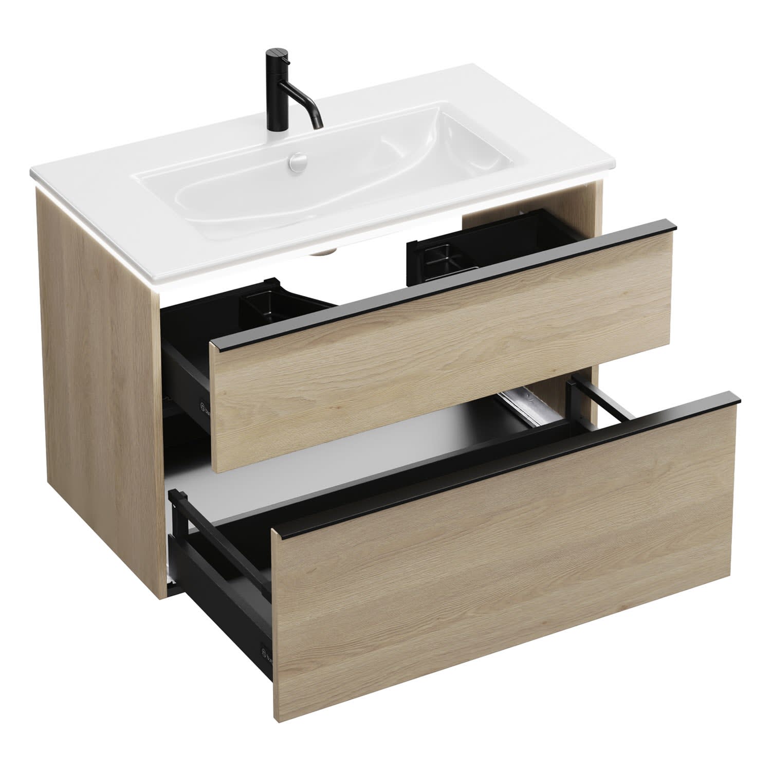 - 1 Schublade oben, 35 cm tief, mit Siphonausschnitt und Inneneinteilung