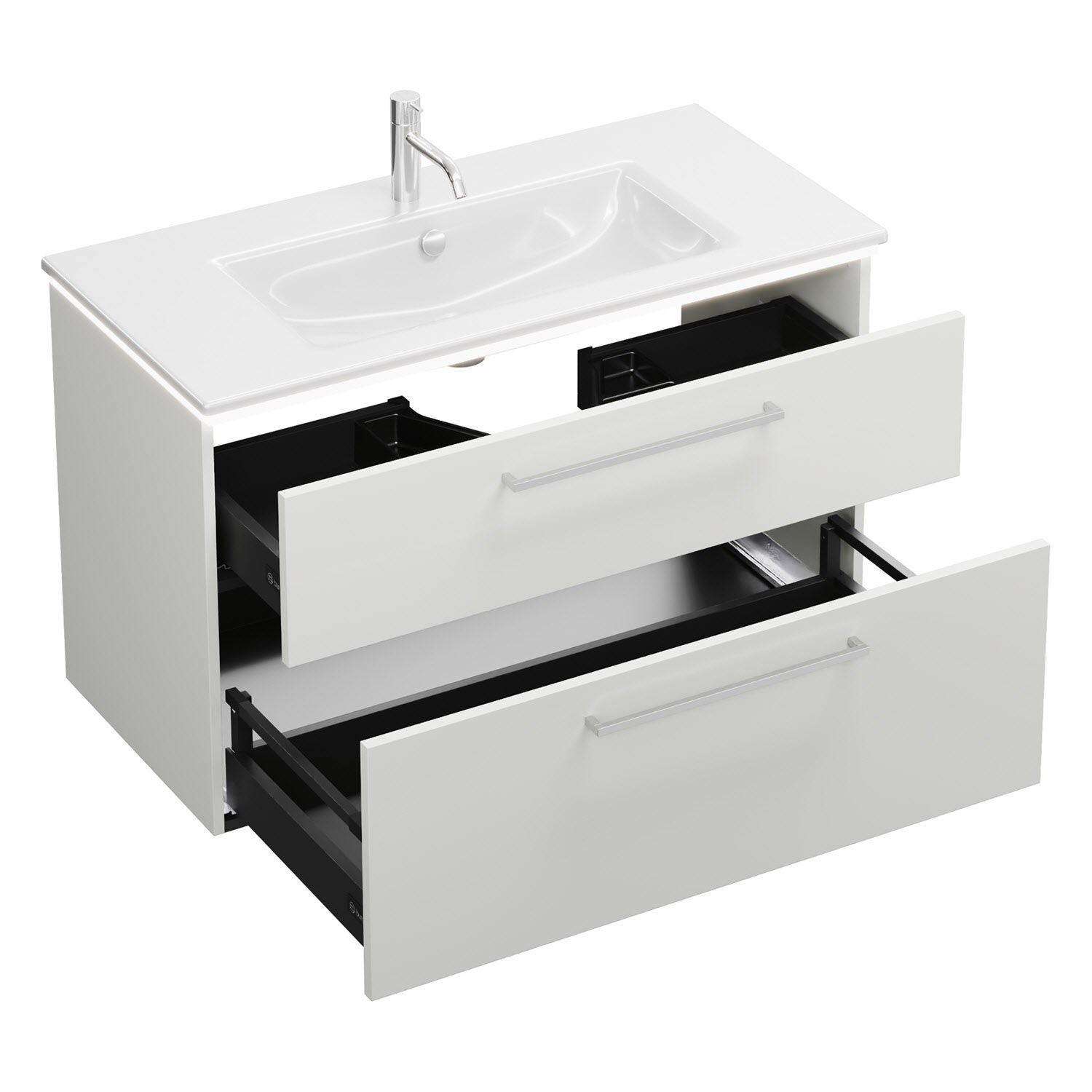 - 1 Schublade oben, 35 cm tief, mit Siphonausschnitt und Inneneinteilung
