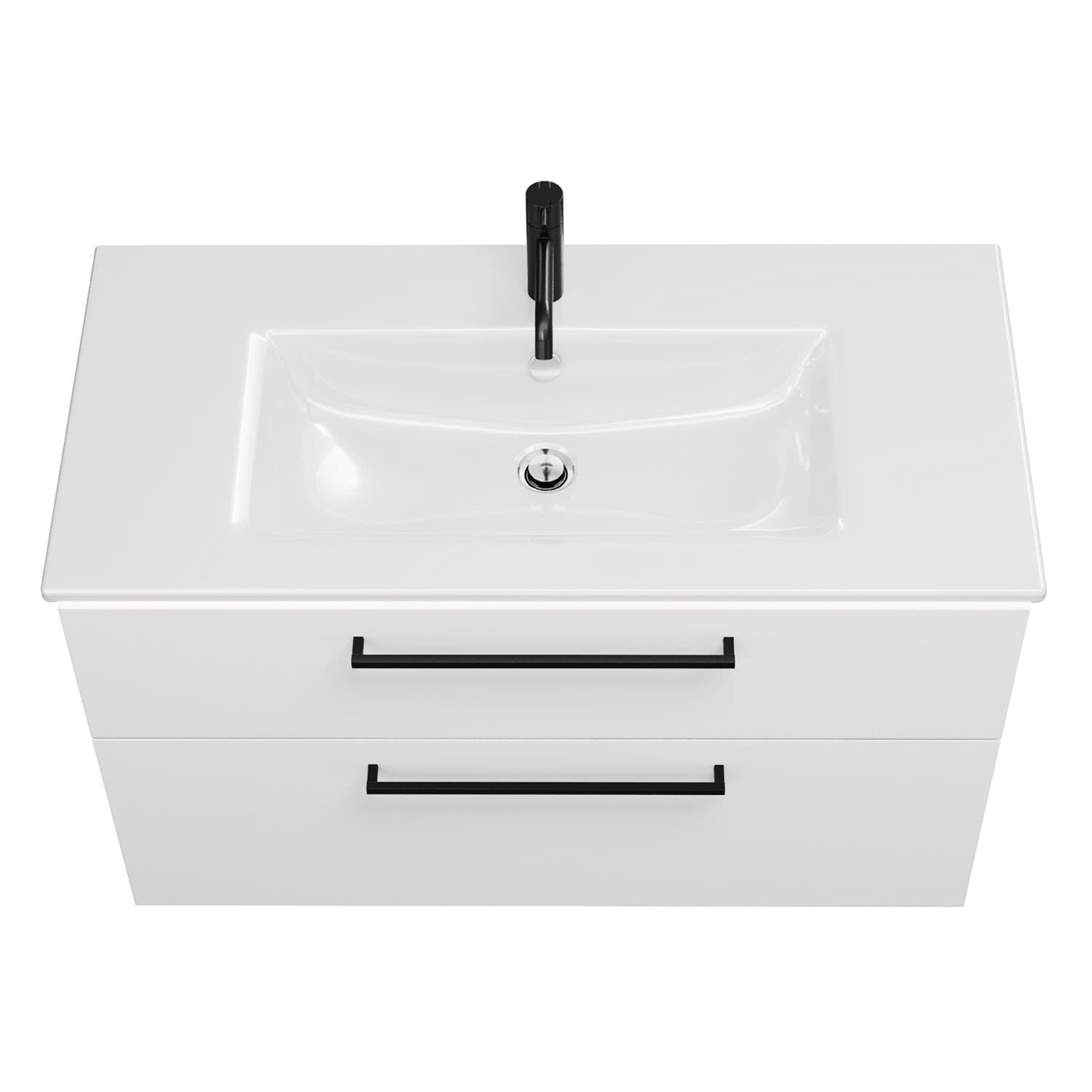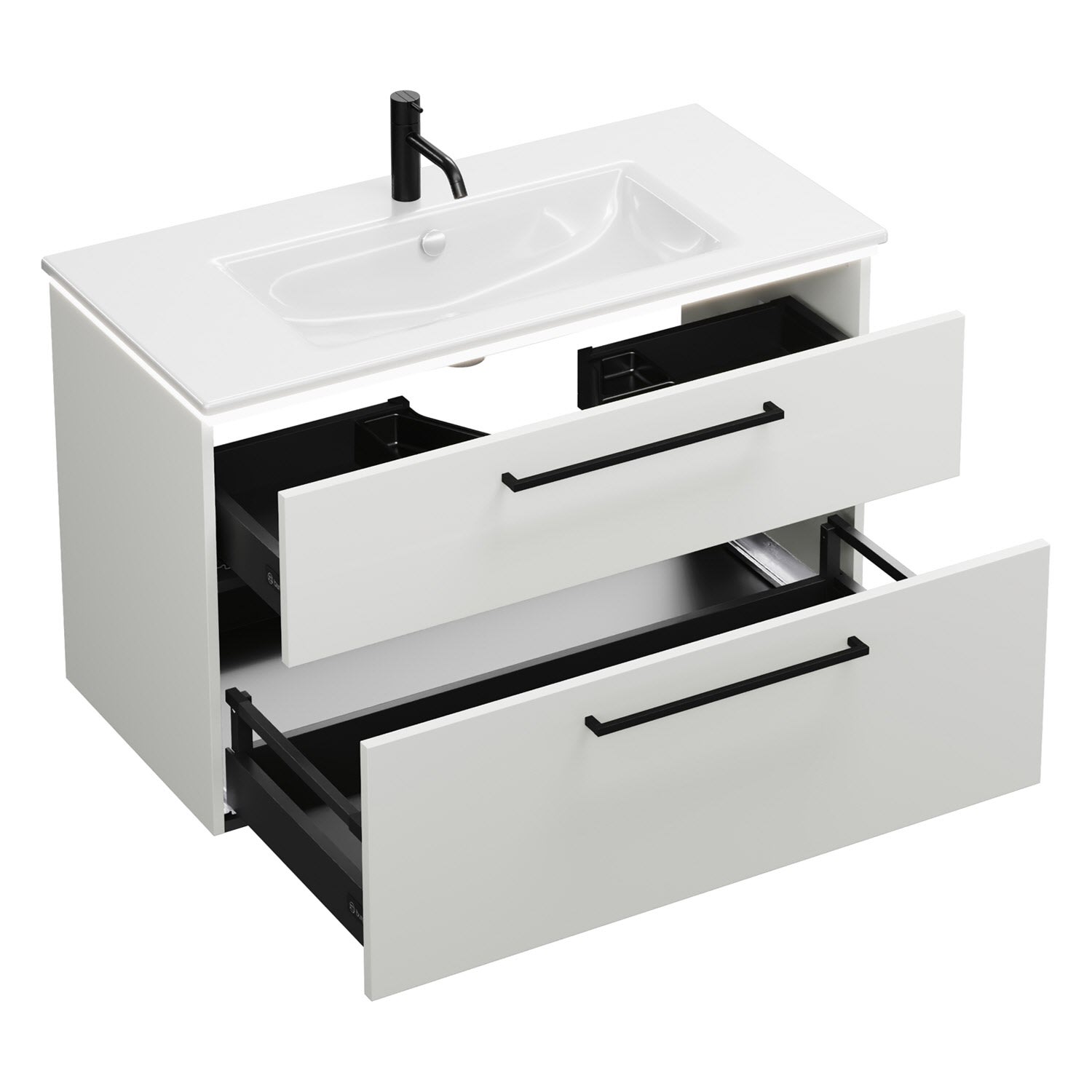 - 1 Schublade oben, 35 cm tief, mit Siphonausschnitt und Inneneinteilung