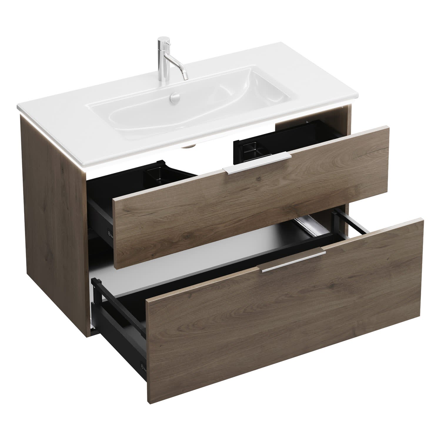 - 1 Schublade oben, 35 cm tief, mit Siphonausschnitt und Inneneinteilung