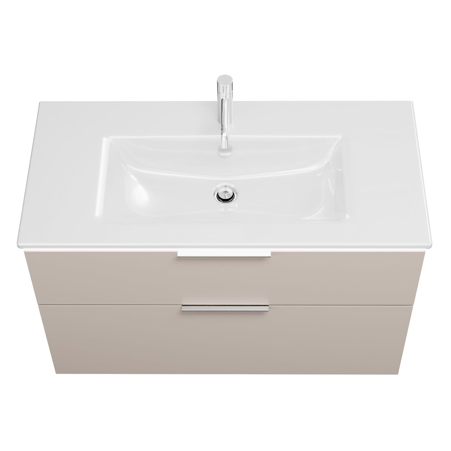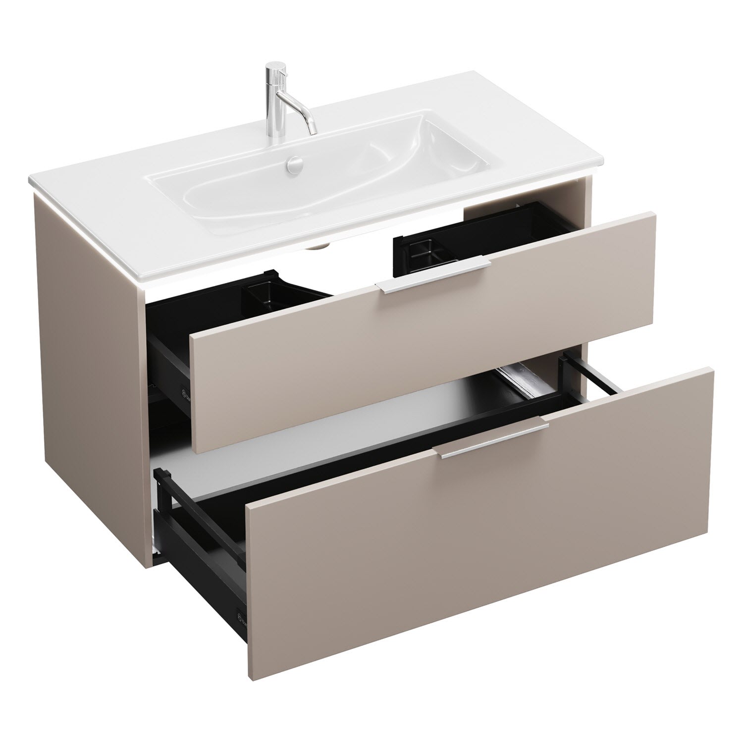 - 1 Schublade oben, 35 cm tief, mit Siphonausschnitt und Inneneinteilung