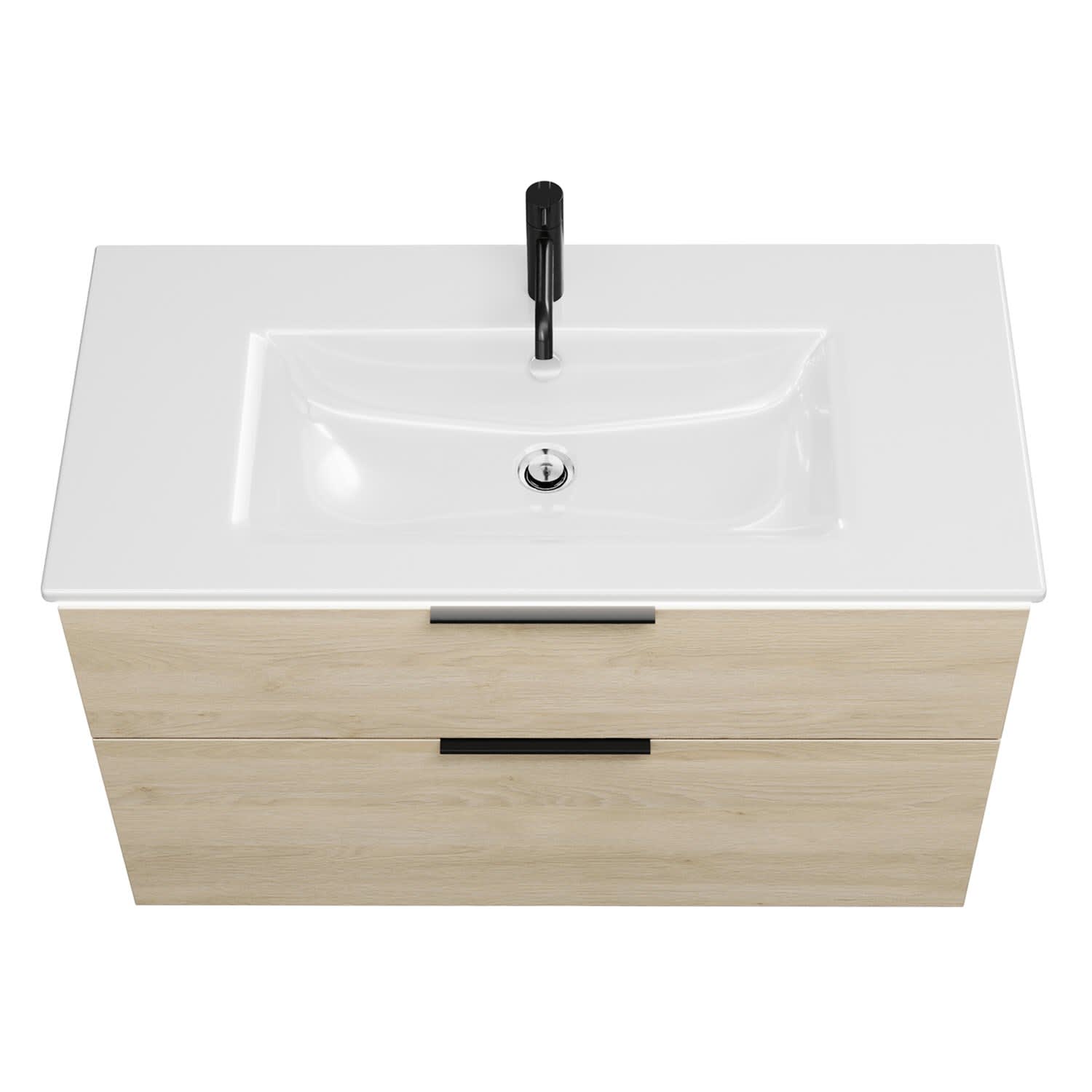 - 1 Schublade oben, 35 cm tief, mit Siphonausschnitt und Inneneinteilung