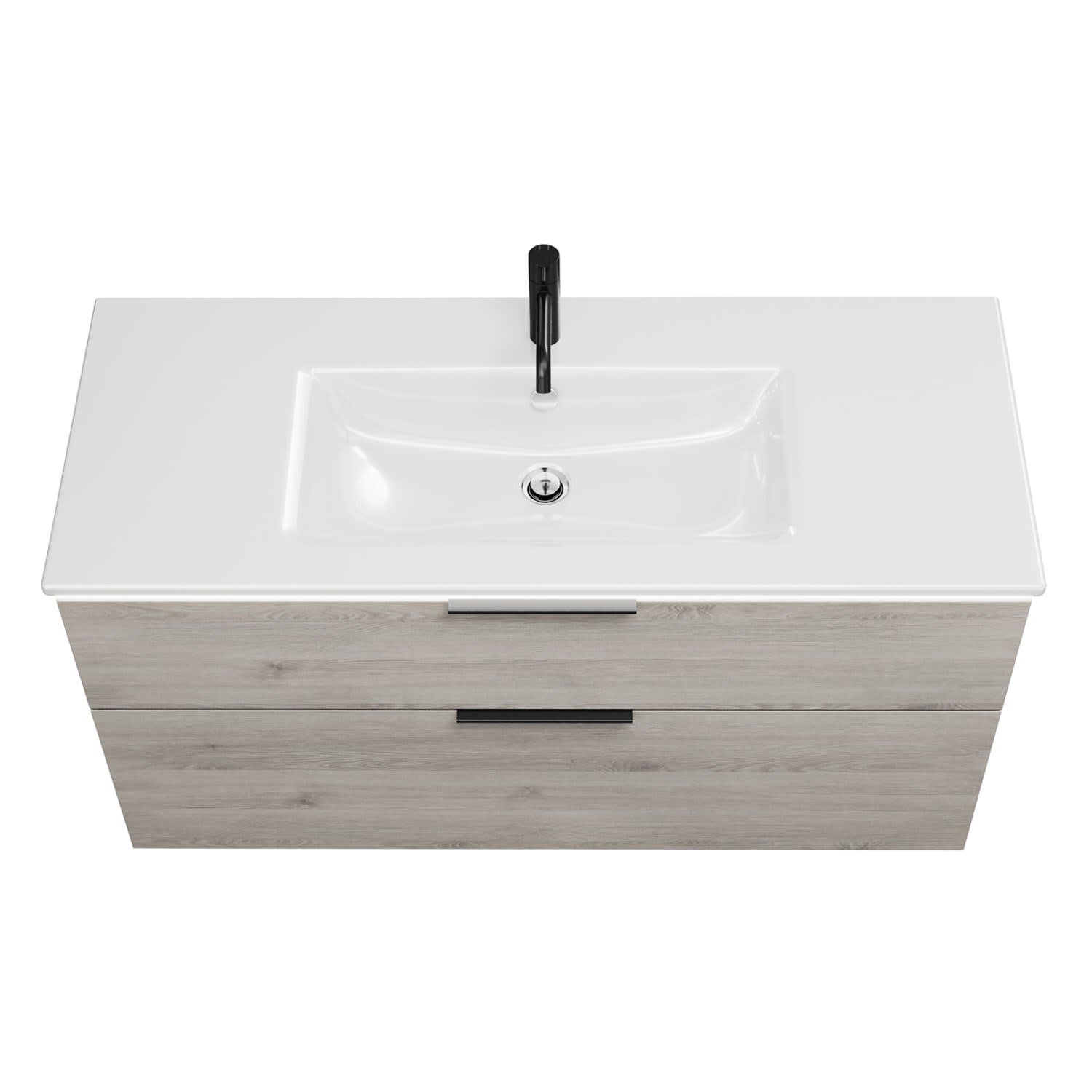 - 1 Schublade oben, 35 cm tief, mit Siphonausschnitt und Inneneinteilung
