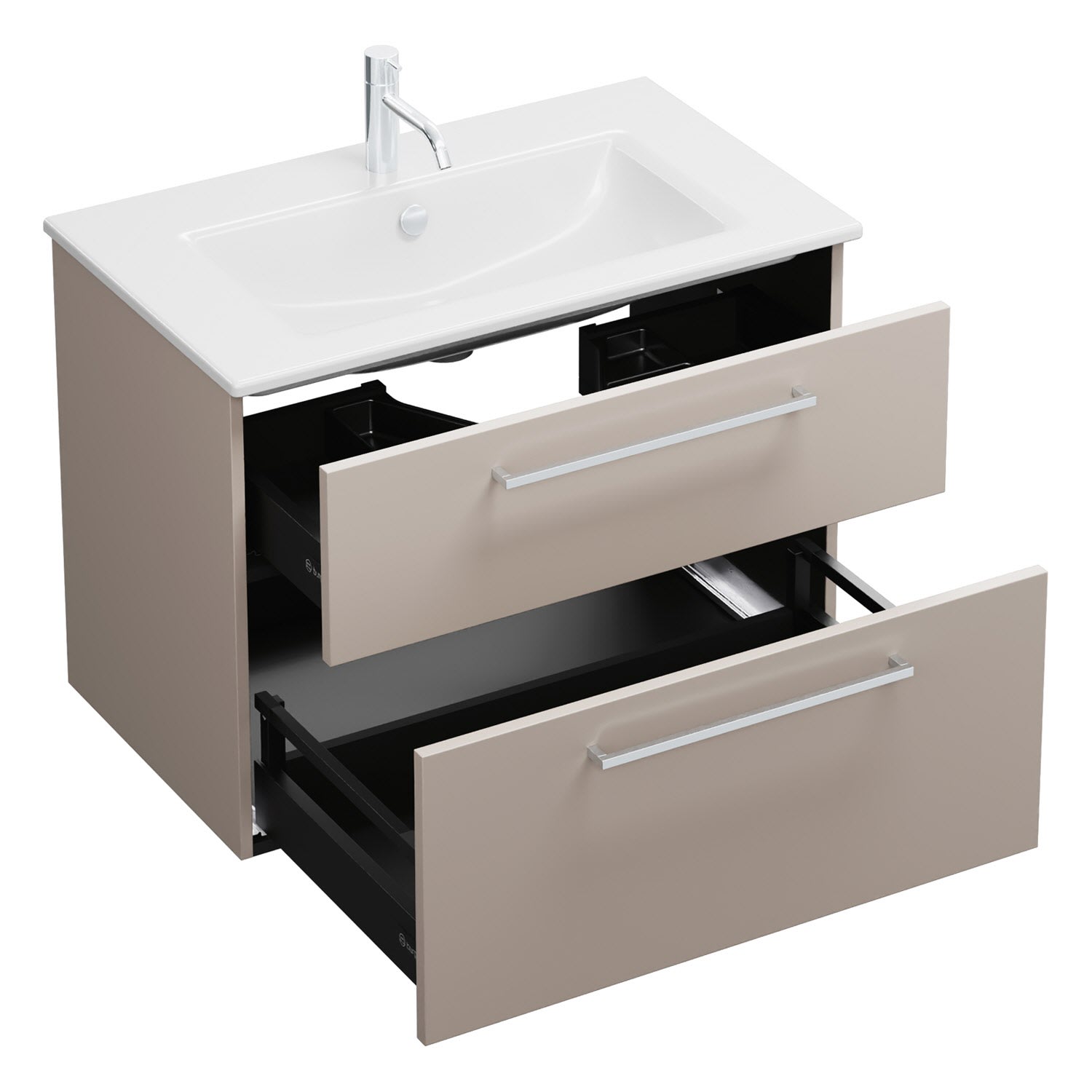 - 1 Schublade oben, 35 cm tief, mit Siphonausschnitt und Inneneinteilung
