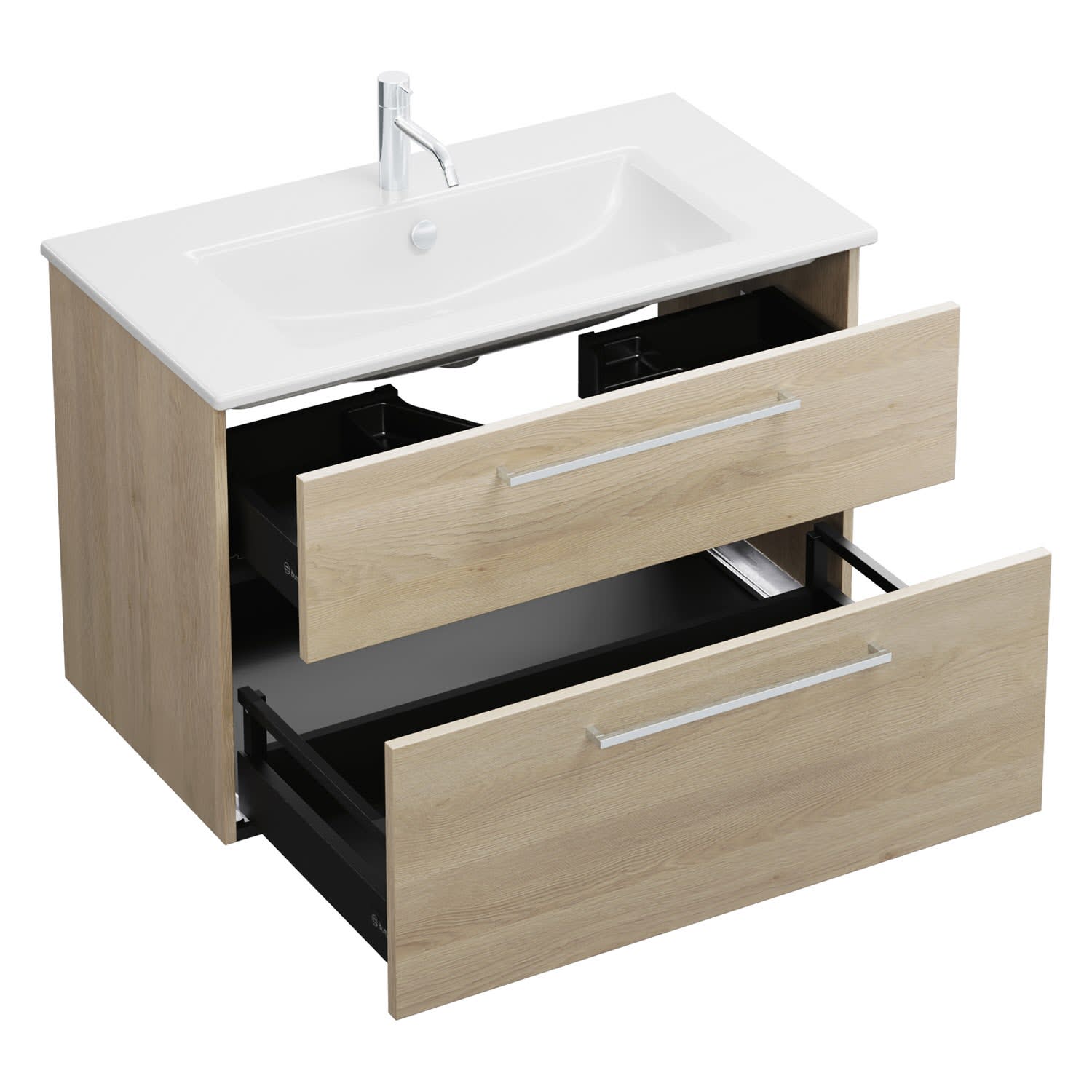 - 1 Schublade oben, 35 cm tief, mit Siphonausschnitt und Inneneinteilung