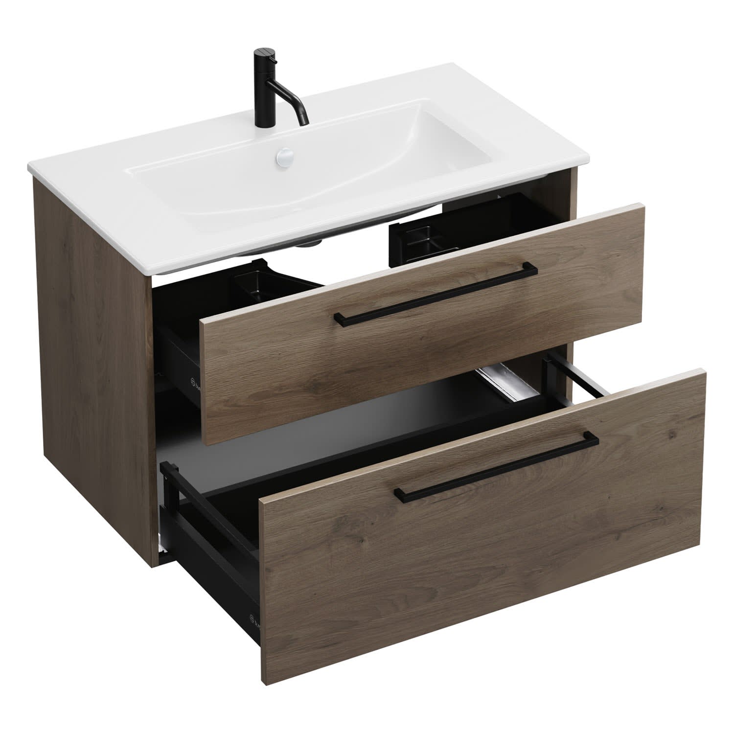 - 1 Schublade oben, 35 cm tief, mit Siphonausschnitt und Inneneinteilung