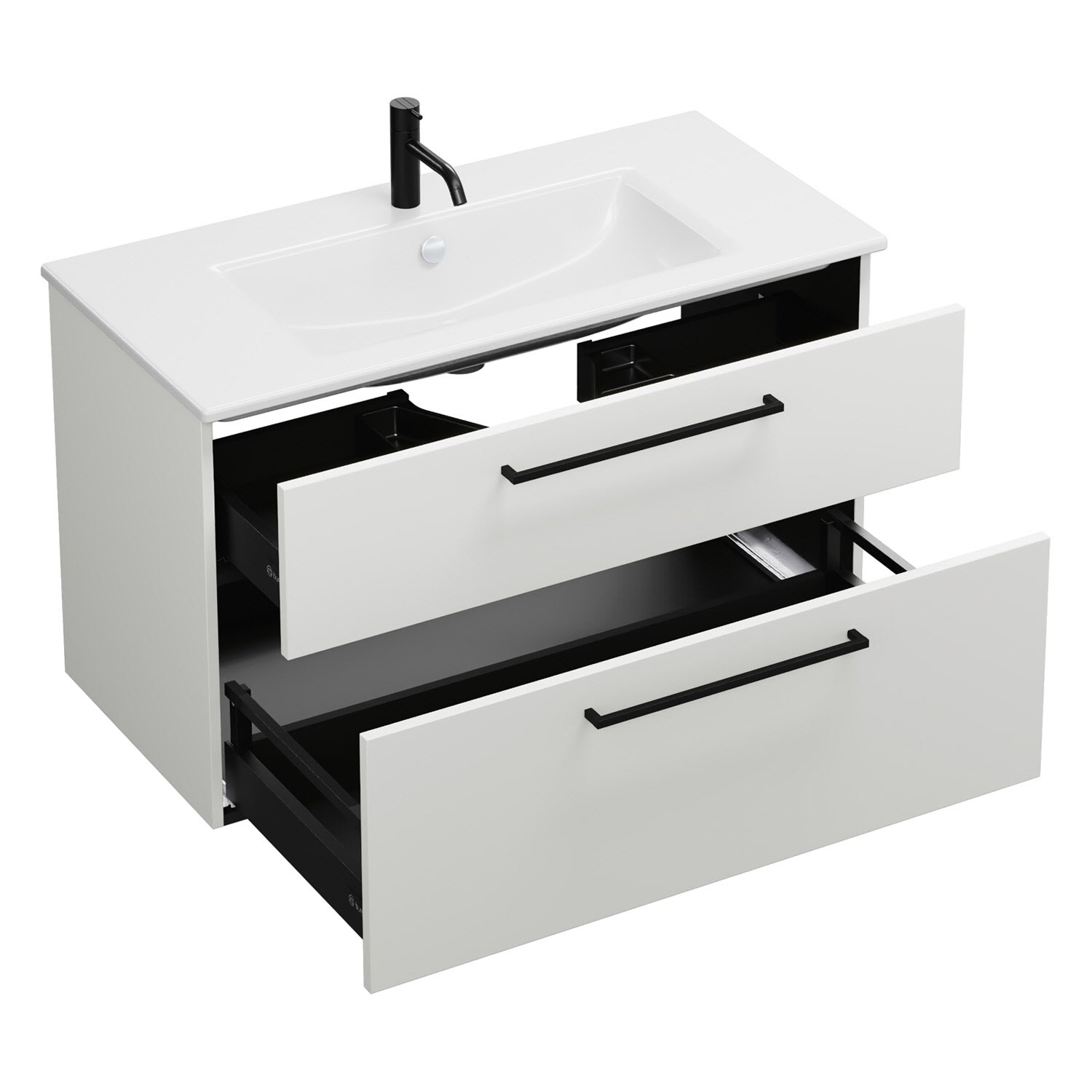 - 1 Schublade oben, 35 cm tief, mit Siphonausschnitt und Inneneinteilung
