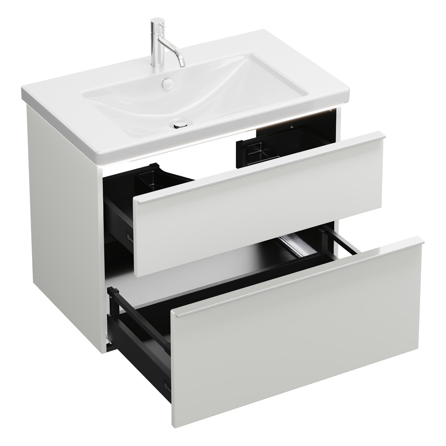 - 1 Schublade oben, 35 cm tief, mit Siphonausschnitt und Inneneinteilung