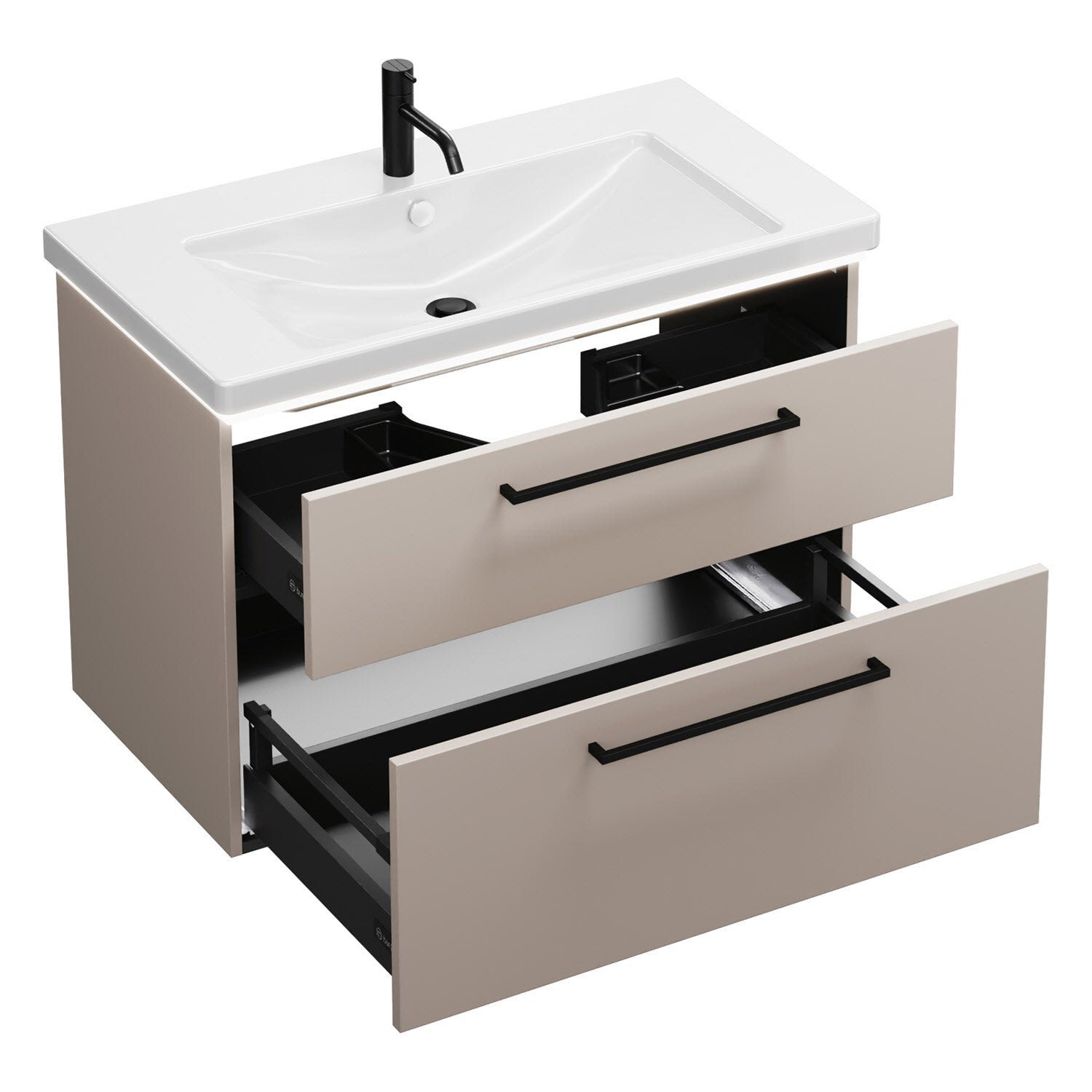 - 1 Schublade oben, 35 cm tief, mit Siphonausschnitt und Inneneinteilung