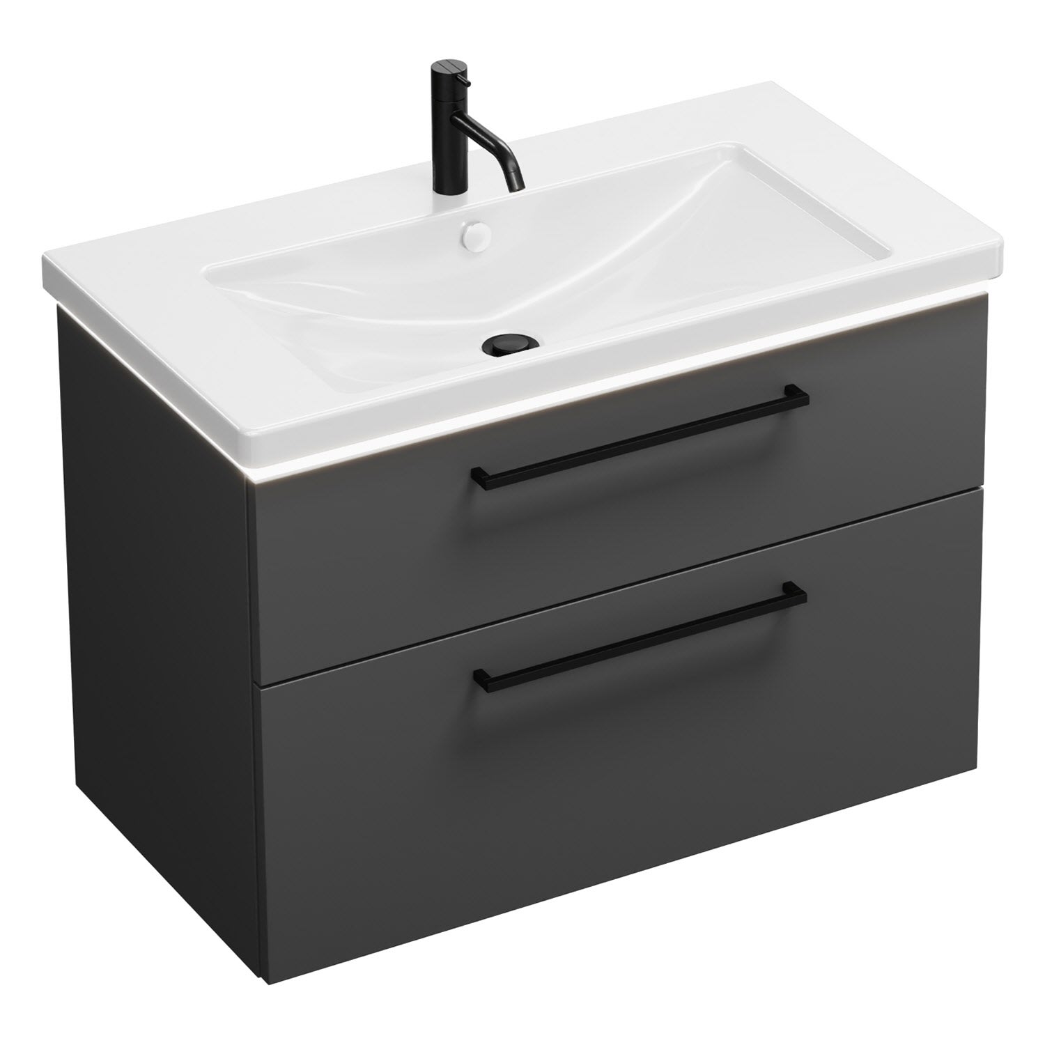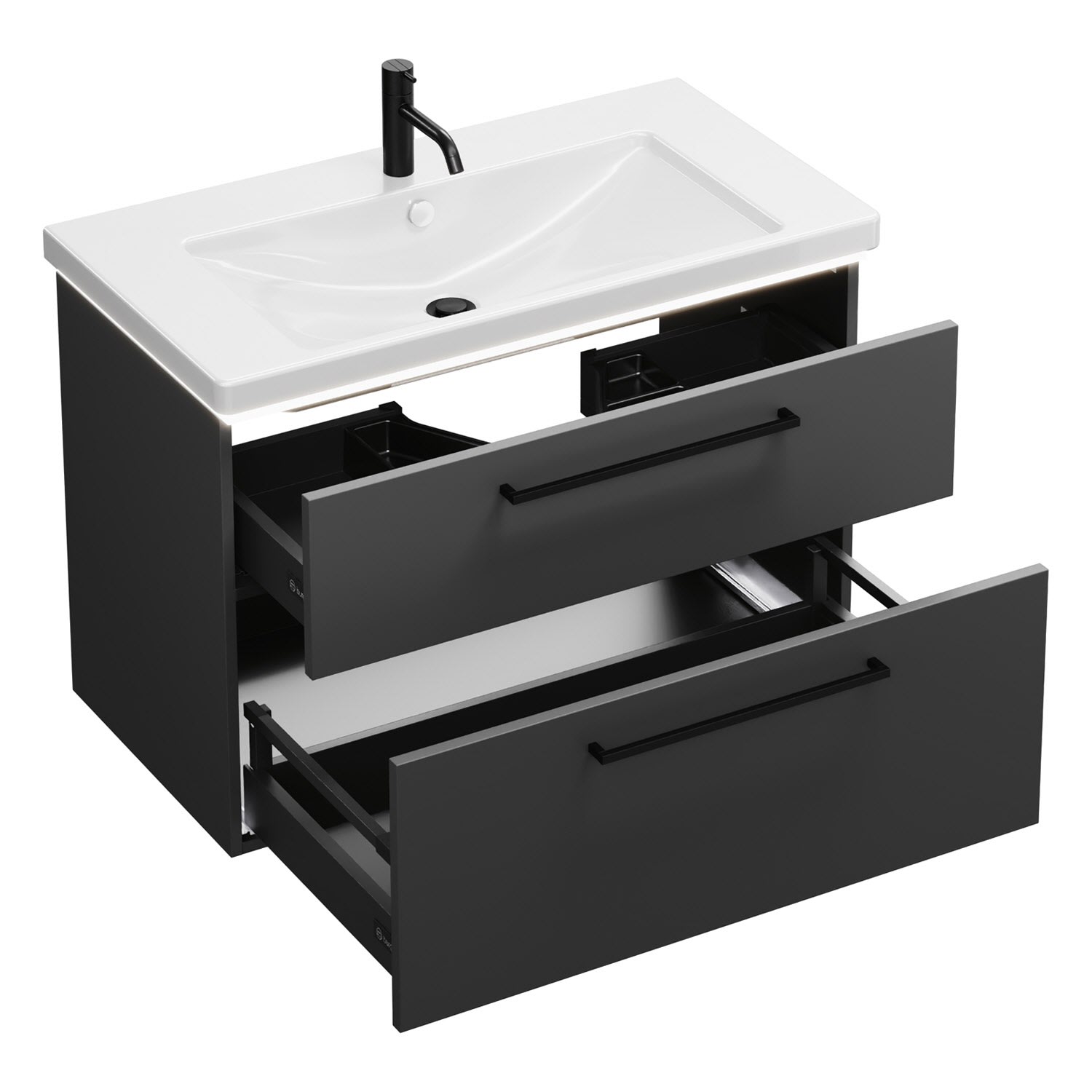 - 1 Schublade oben, 35 cm tief, mit Siphonausschnitt und Inneneinteilung