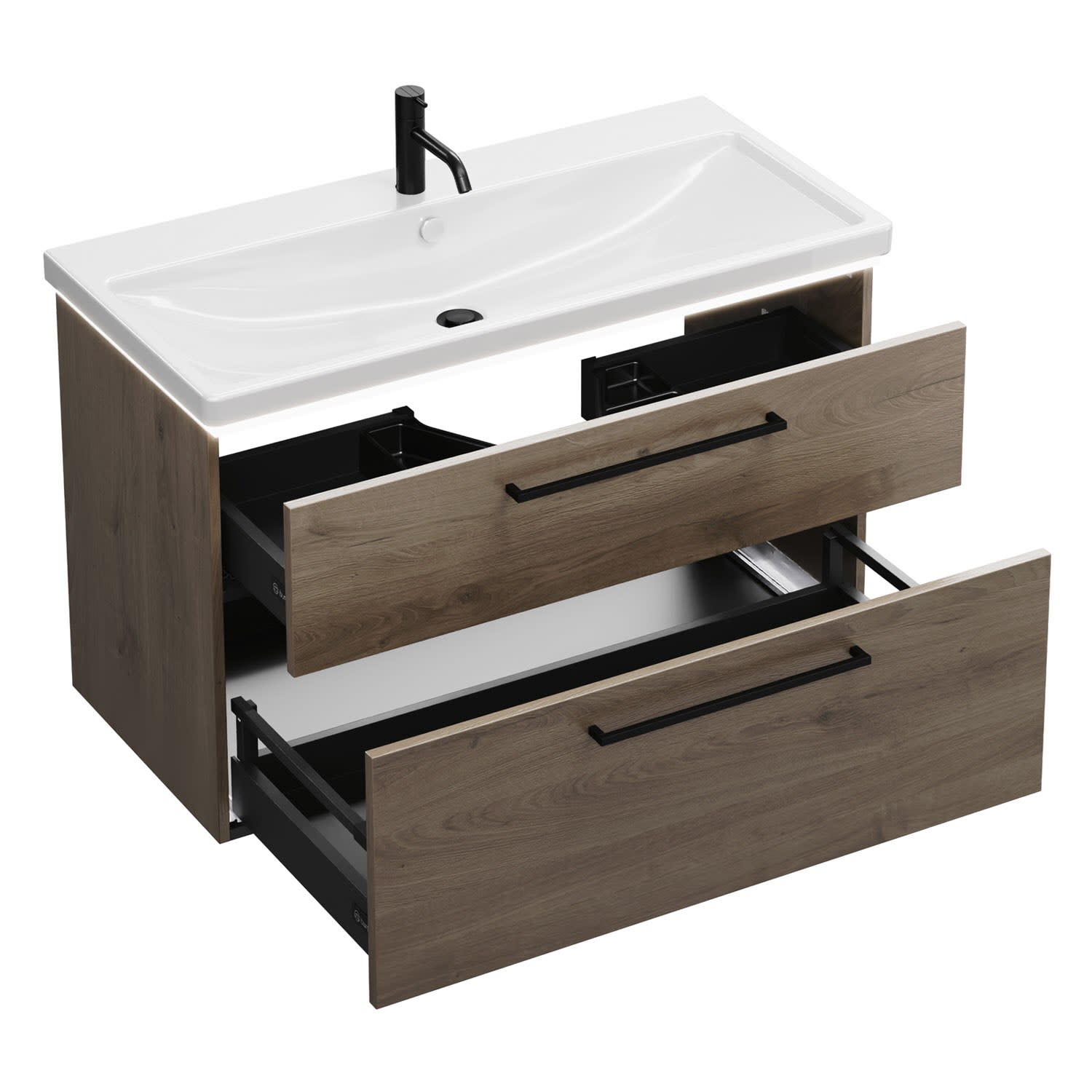 - 1 Schublade oben, 35 cm tief, mit Siphonausschnitt und Inneneinteilung