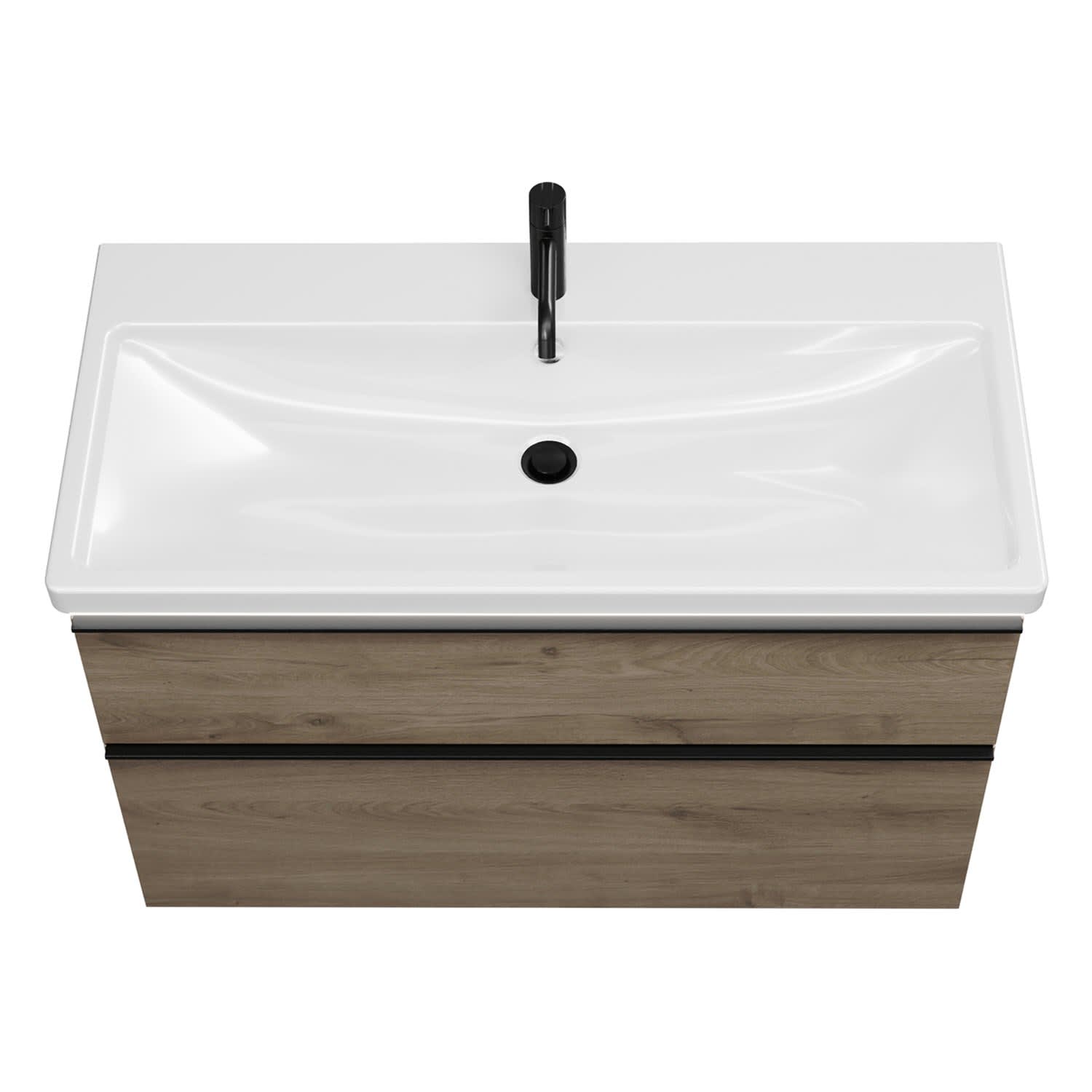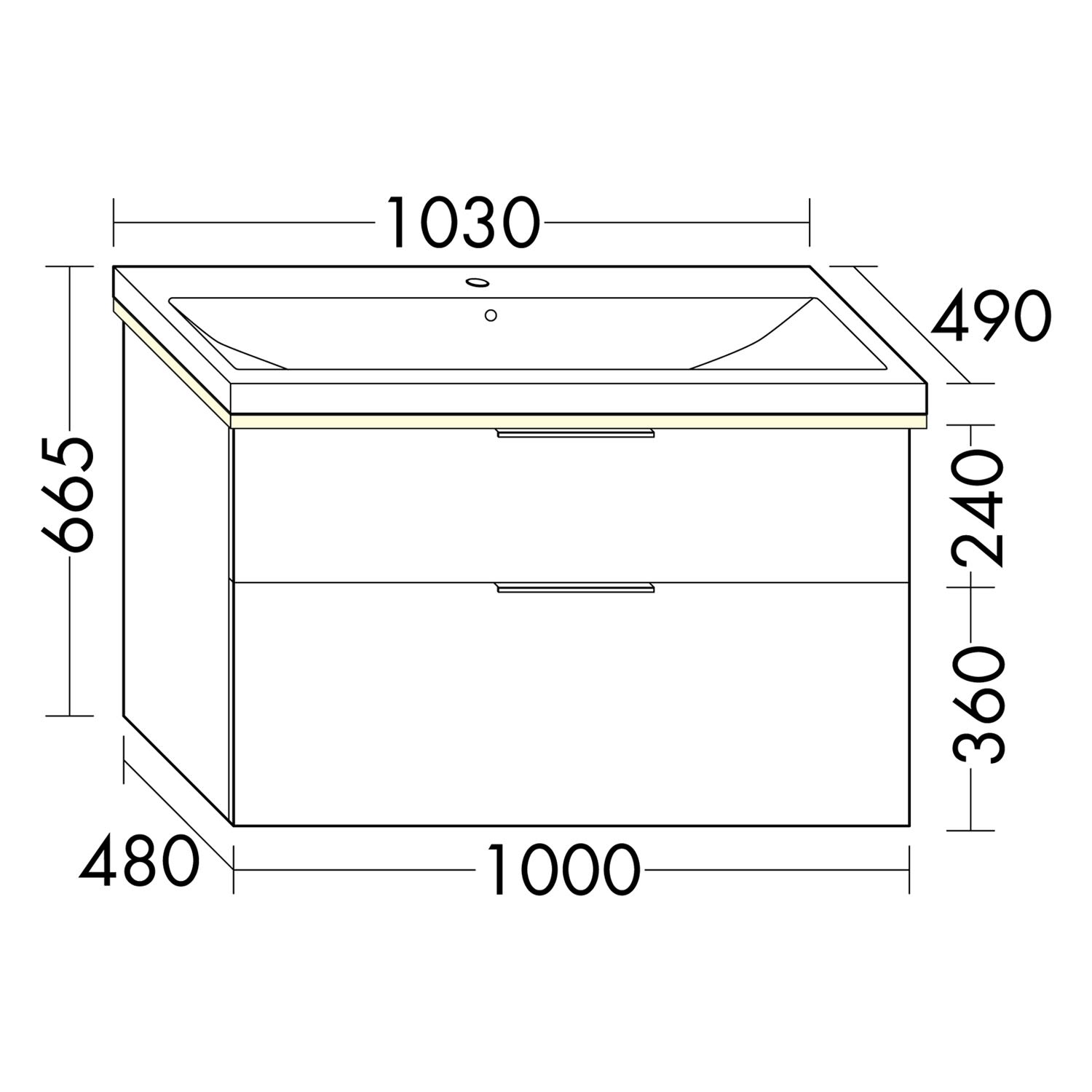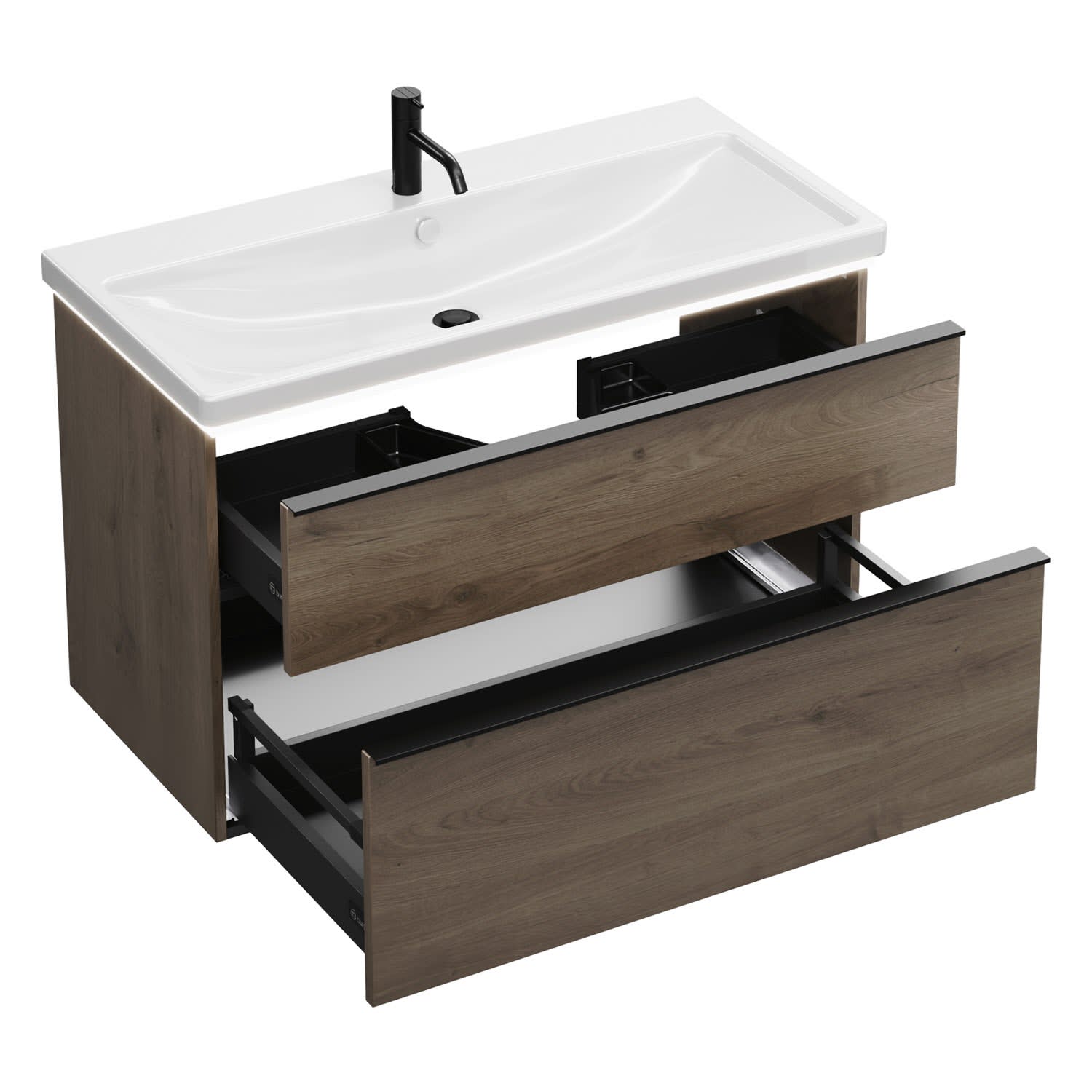 - 1 Schublade oben, 35 cm tief, mit Siphonausschnitt und Inneneinteilung