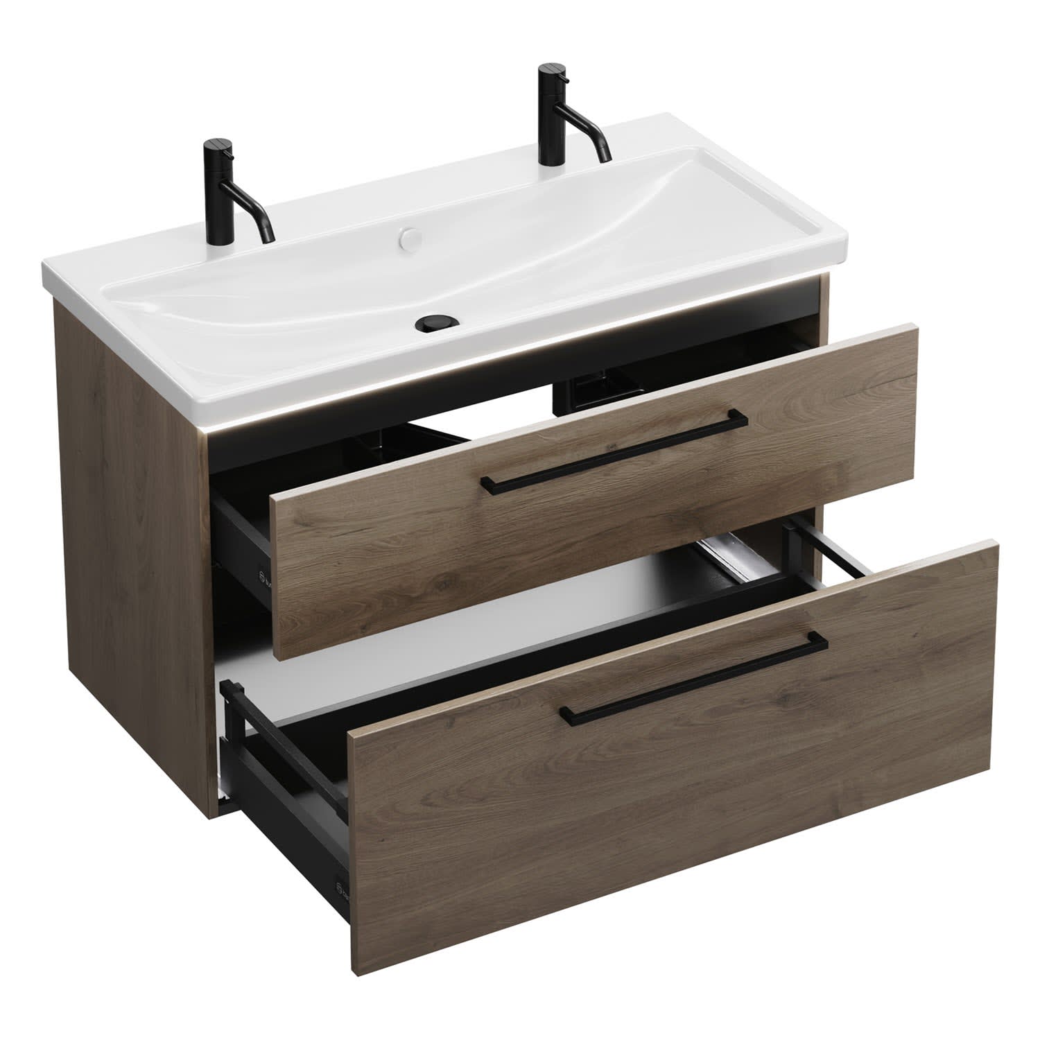 - 1 Schublade oben, 35 cm tief, mit Siphonausschnitt und Inneneinteilung