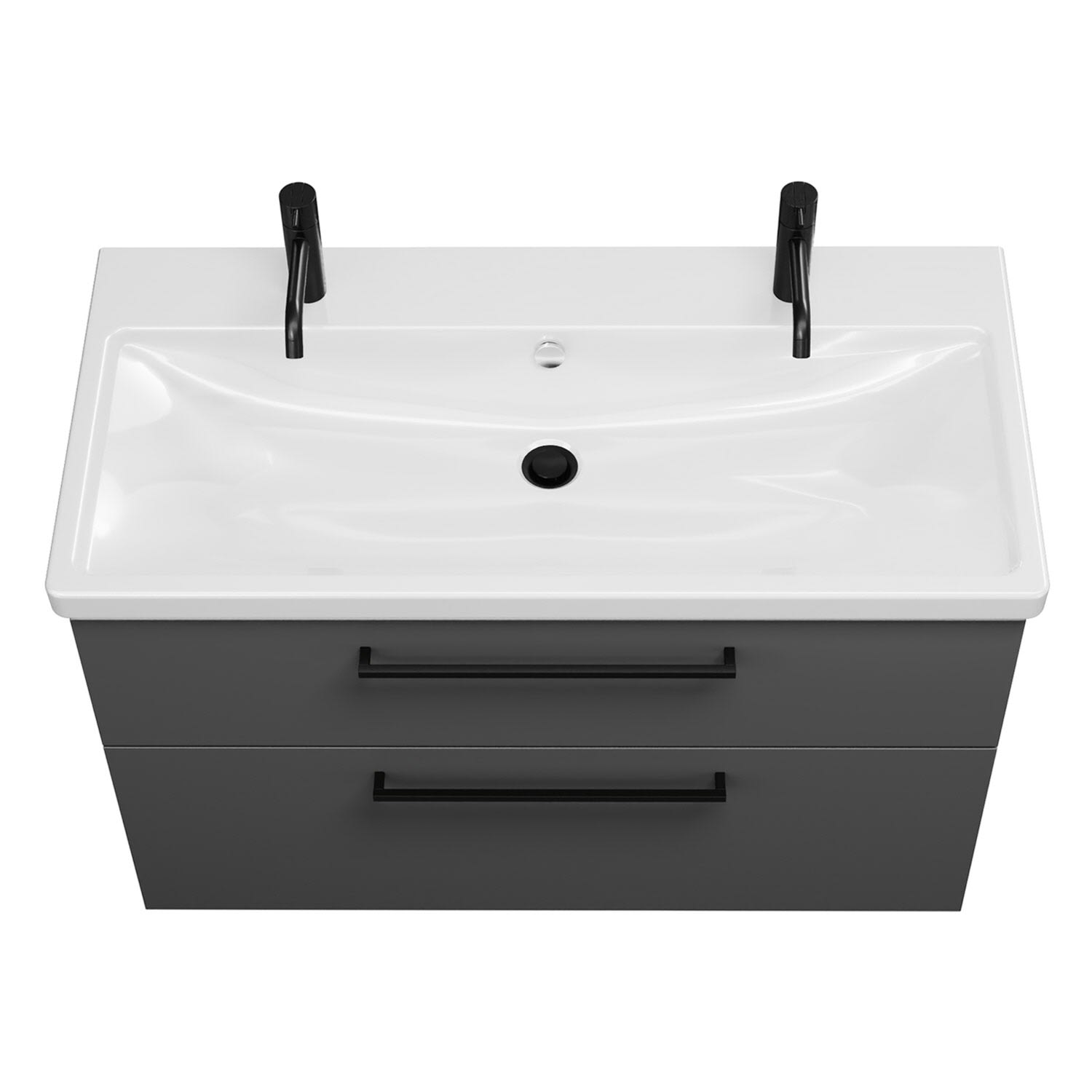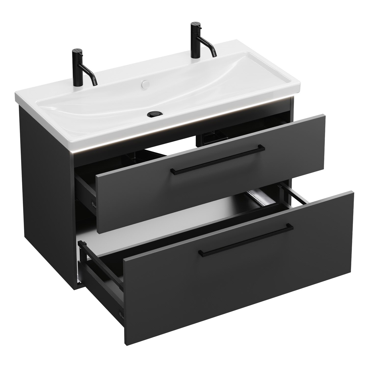 - 1 Schublade oben, 35 cm tief, mit Siphonausschnitt und Inneneinteilung