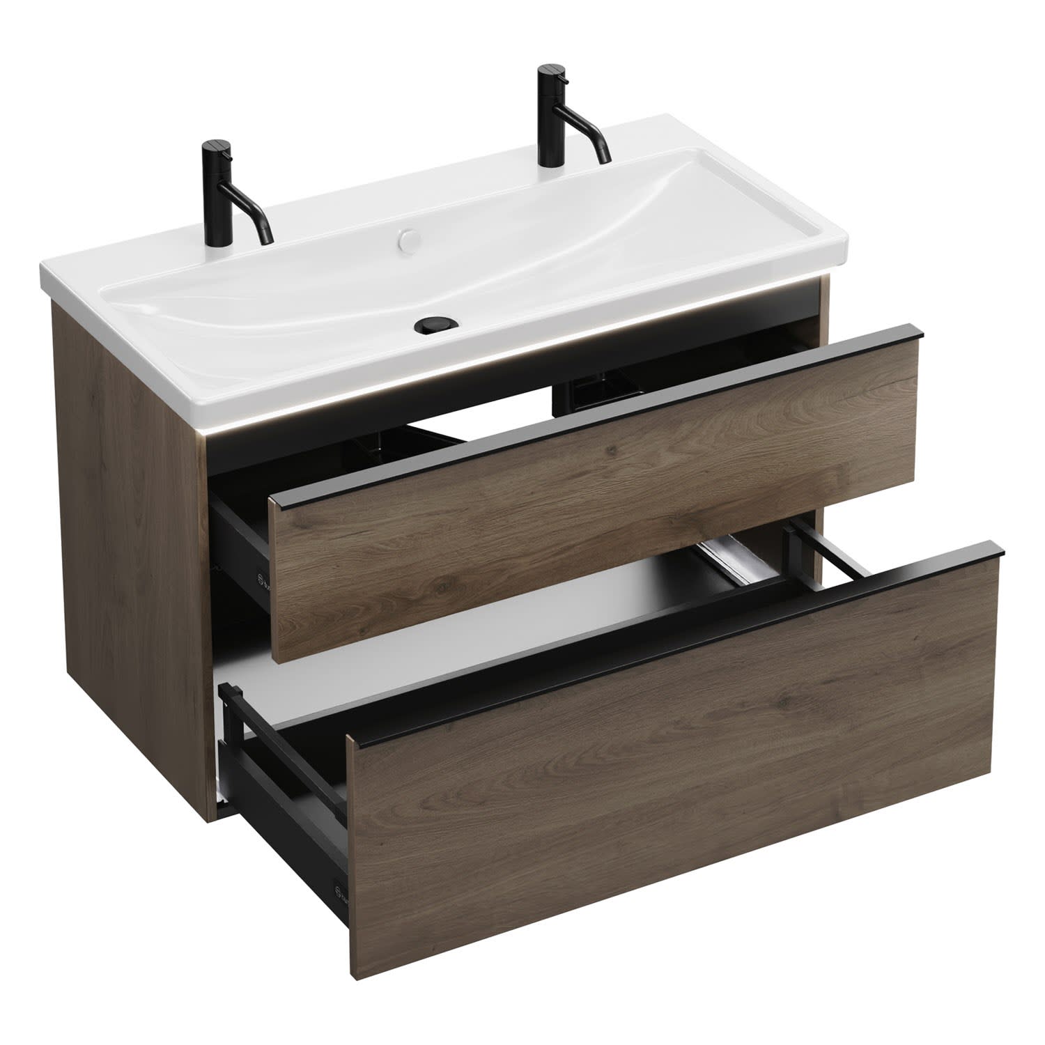 - 1 Schublade oben, 35 cm tief, mit Siphonausschnitt und Inneneinteilung