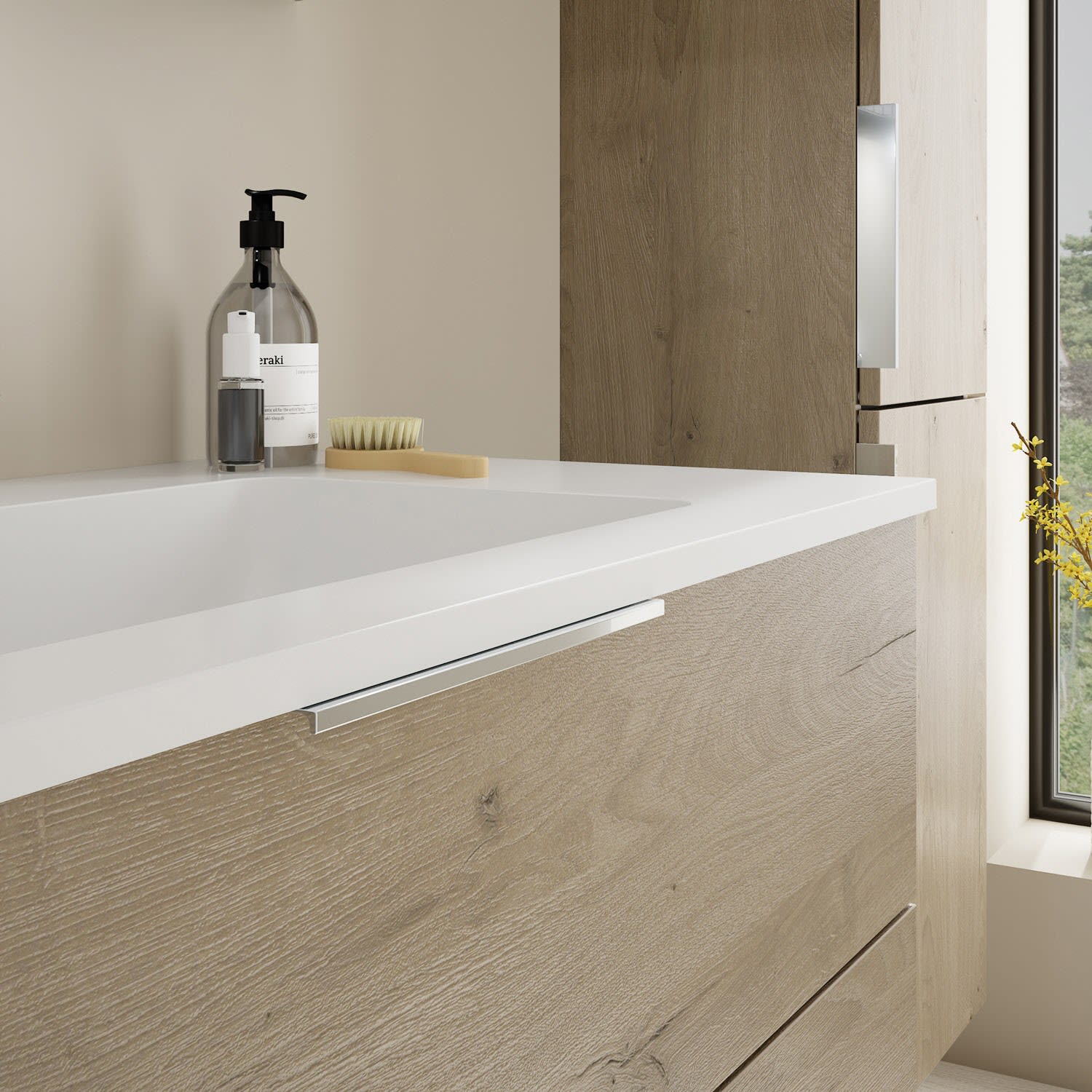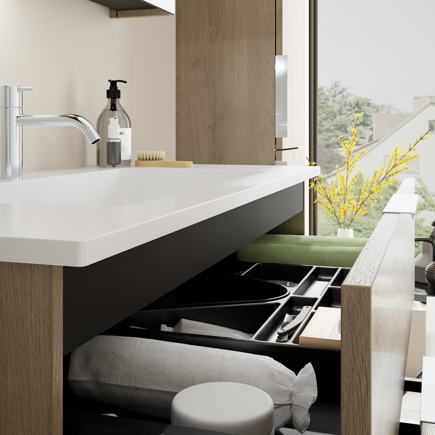 - 1 Schublade oben, 35 cm tief, mit Siphonausschnitt und Inneneinteilung