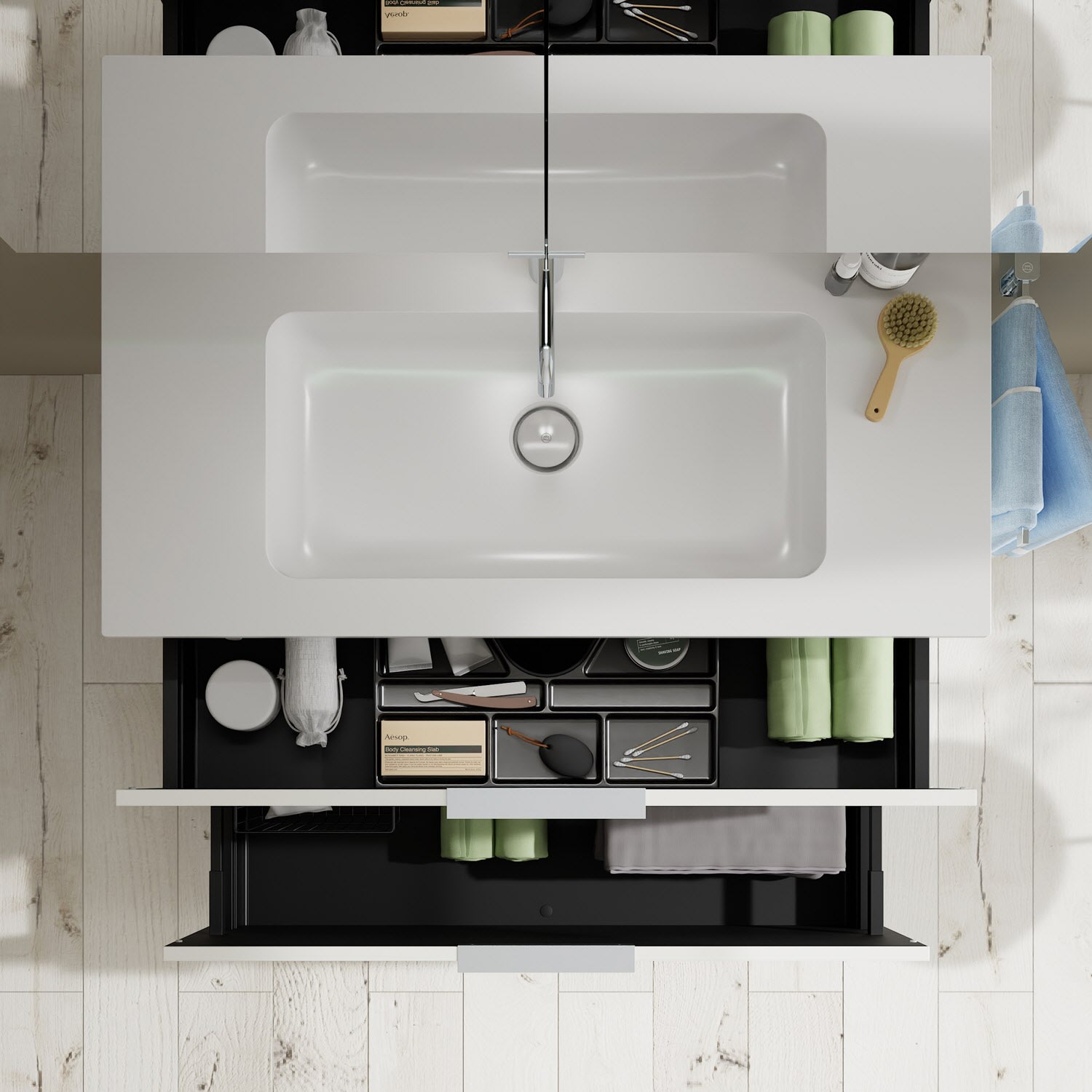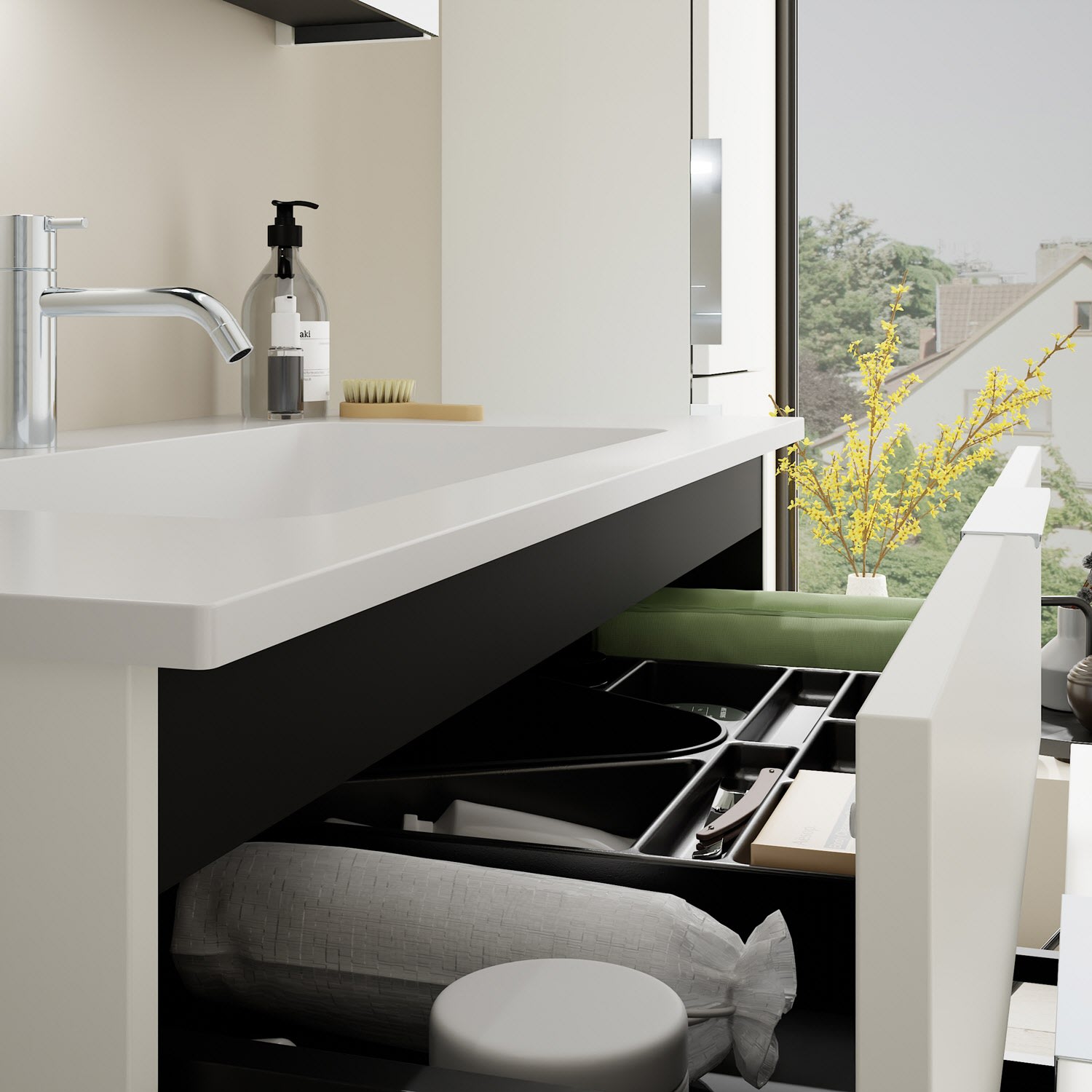 - 1 Schublade oben, 35 cm tief, mit Siphonausschnitt und Inneneinteilung
