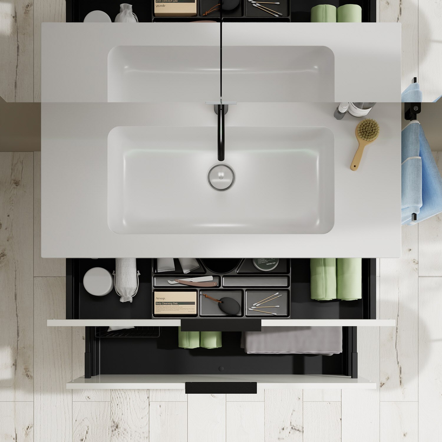 - 1 Schublade oben, 35 cm tief, mit Siphonausschnitt und Inneneinteilung