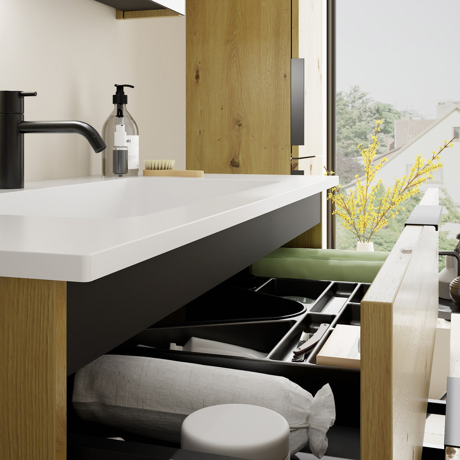 - 1 Schublade oben, 35 cm tief, mit Siphonausschnitt und Inneneinteilung
