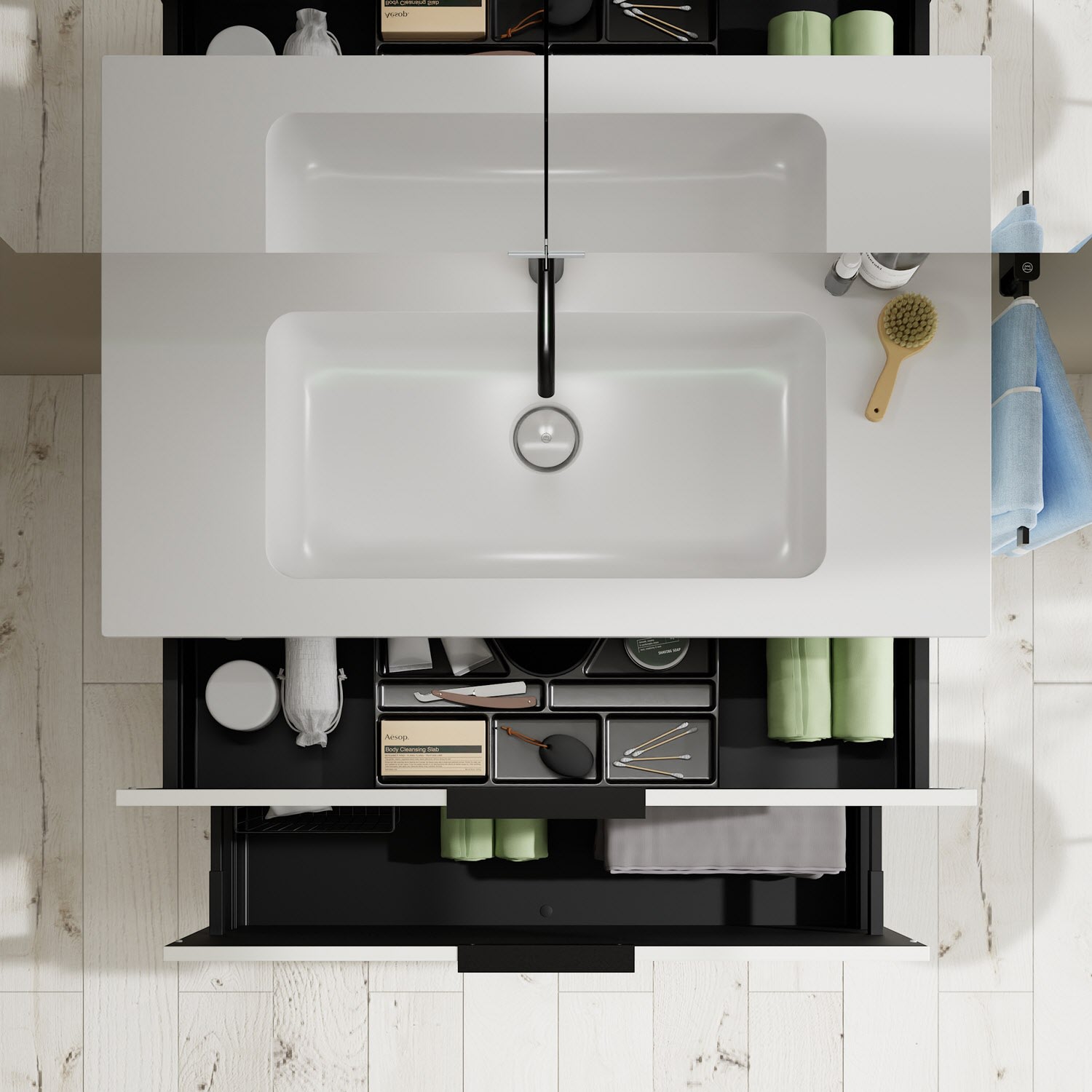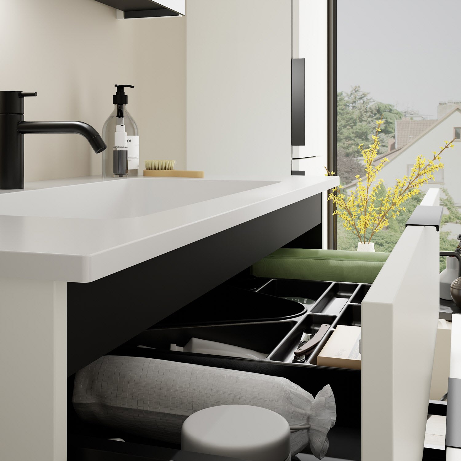 - 1 Schublade oben, 35 cm tief, mit Siphonausschnitt und Inneneinteilung