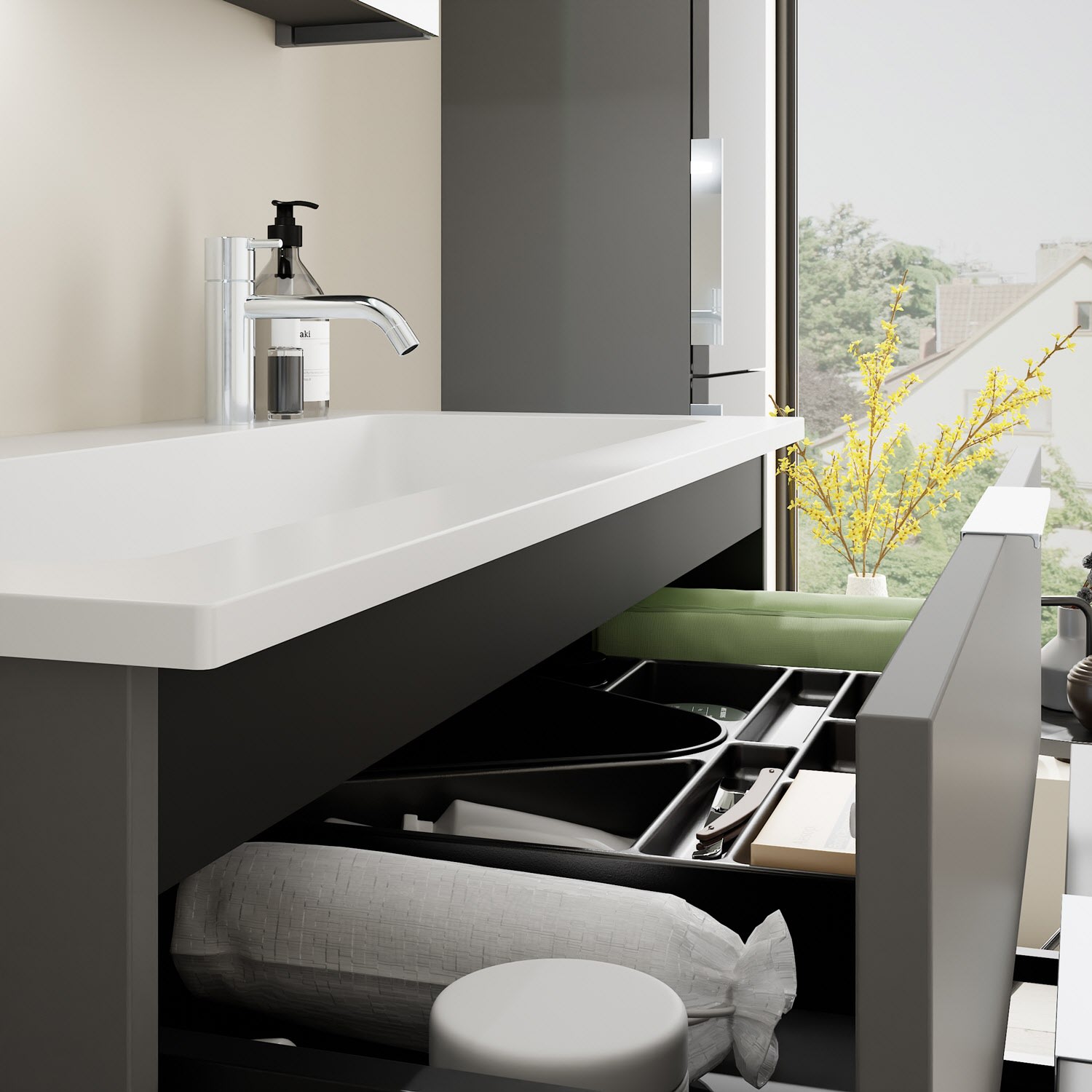 - 1 Schublade oben, 35 cm tief, mit Siphonausschnitt und Inneneinteilung
