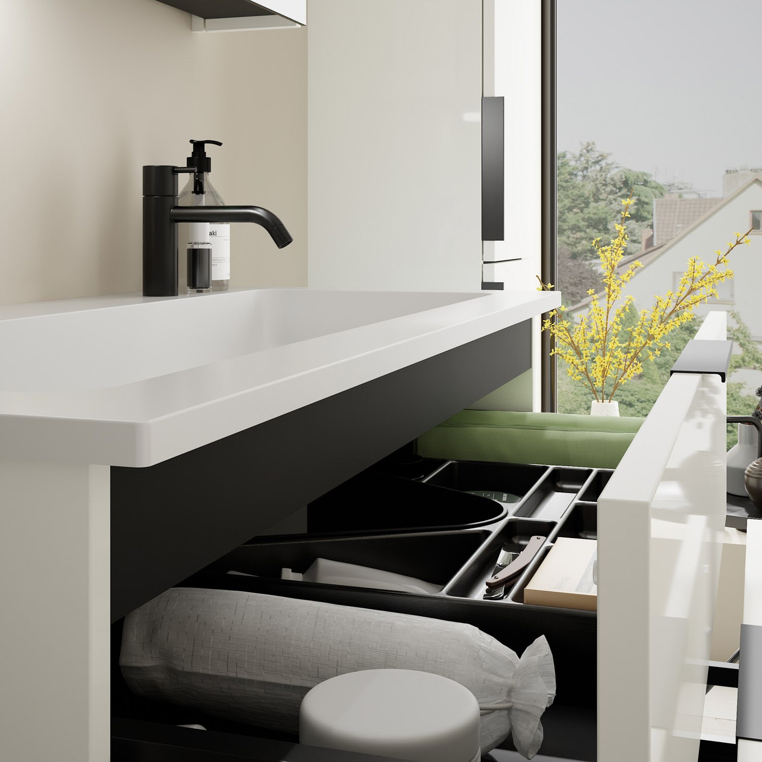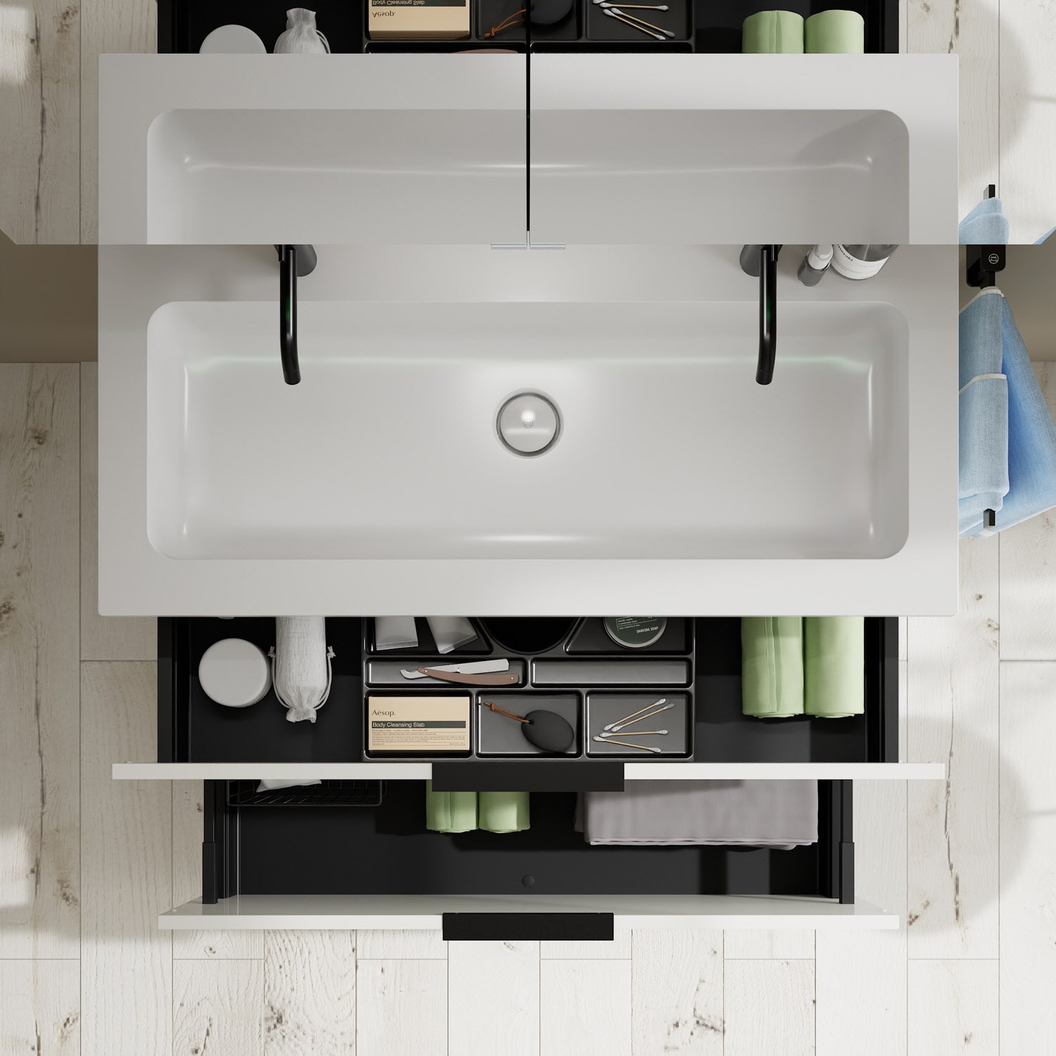 - 1 Schublade oben, 35 cm tief, mit Siphonausschnitt und Inneneinteilung