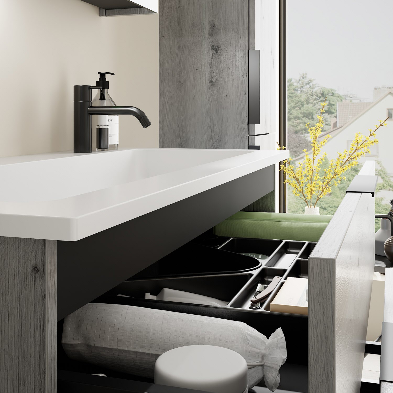 - 1 Schublade oben, 35 cm tief, mit Siphonausschnitt und Inneneinteilung