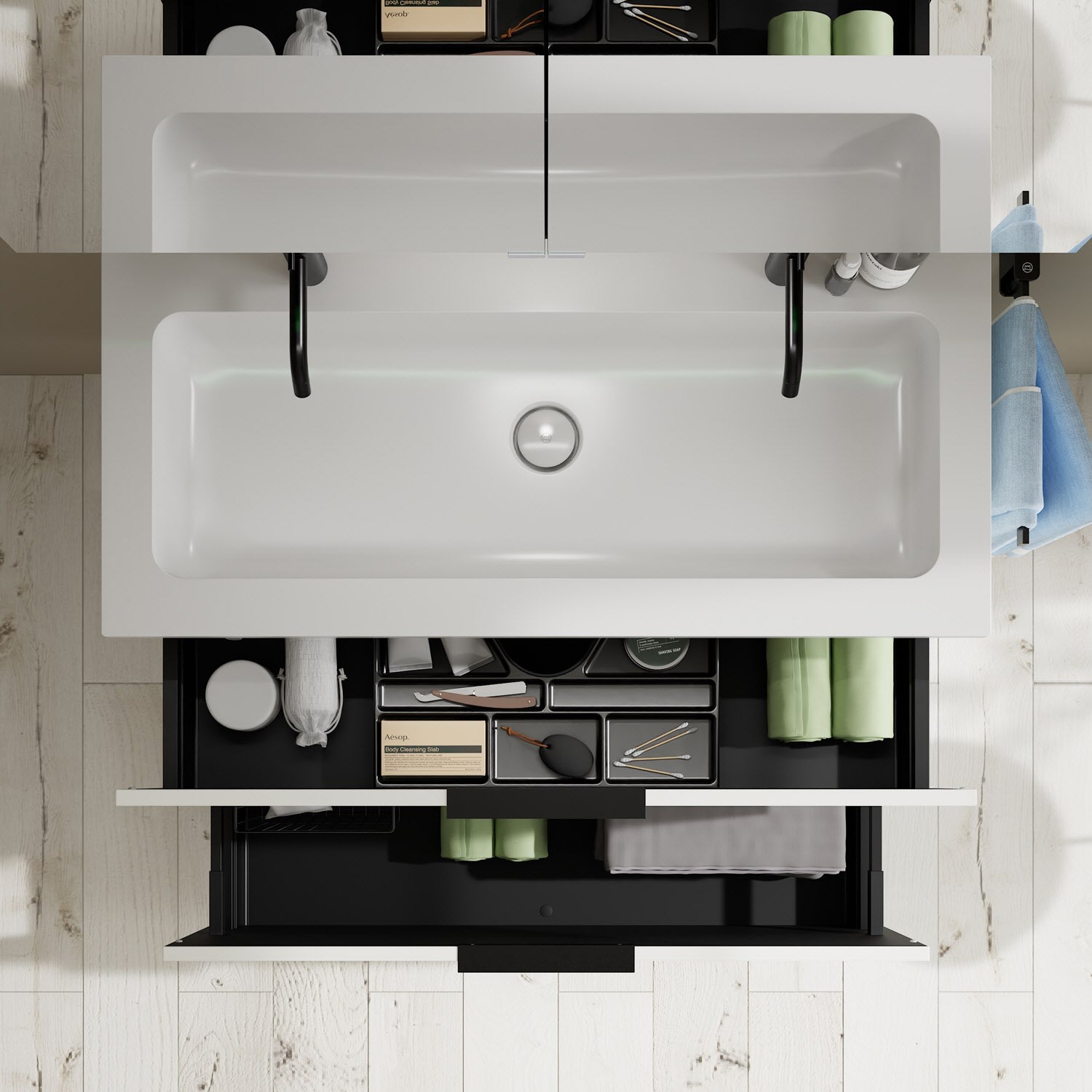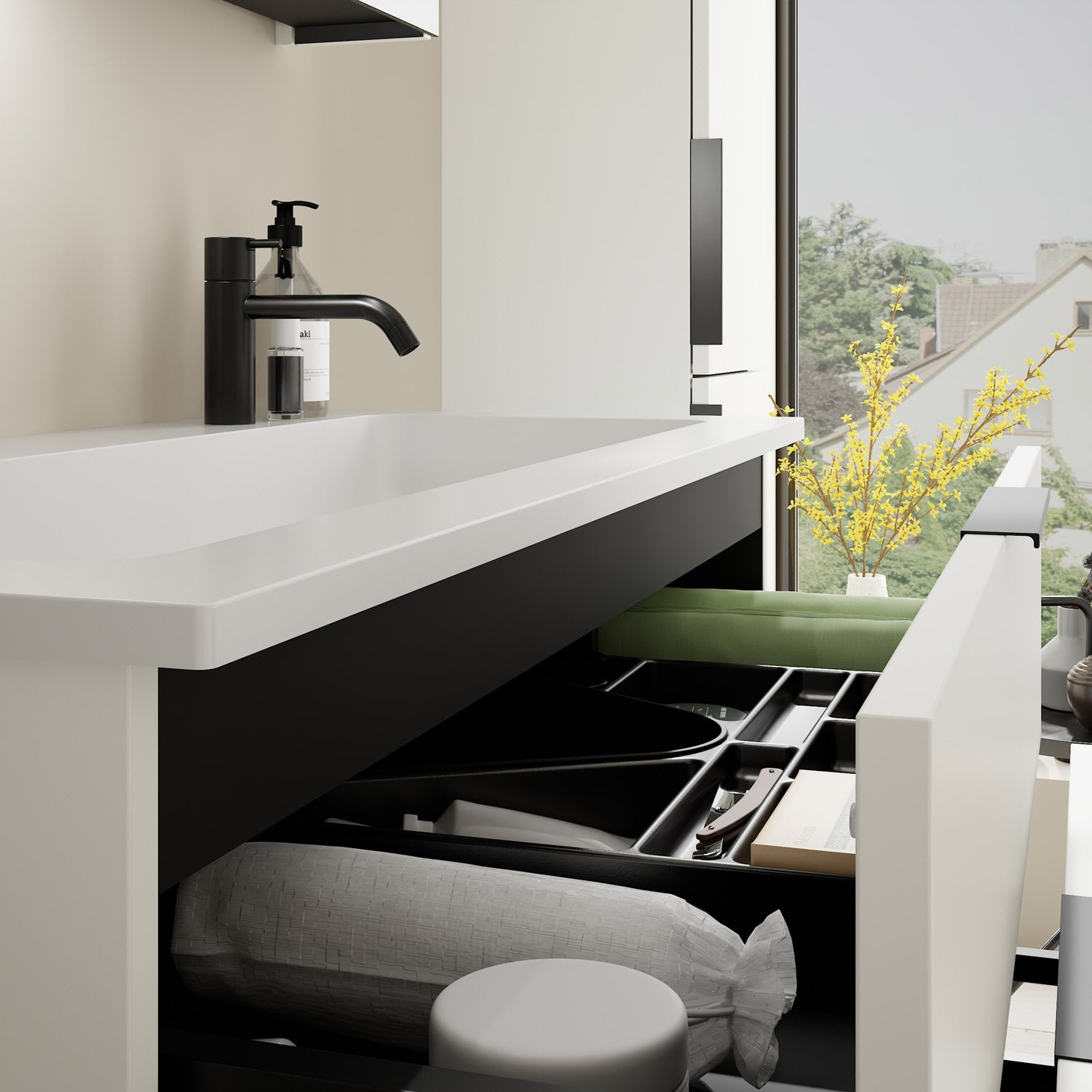 - 1 Schublade oben, 35 cm tief, mit Siphonausschnitt und Inneneinteilung