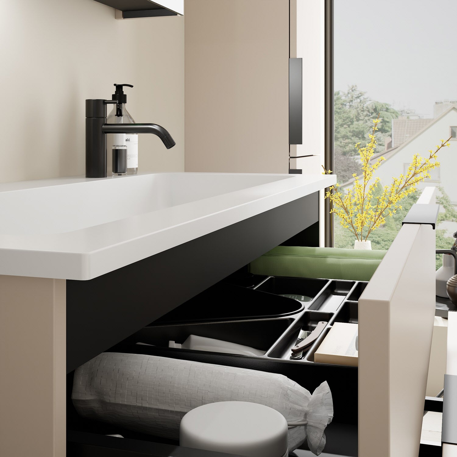 - 1 Schublade oben, 35 cm tief, mit Siphonausschnitt und Inneneinteilung