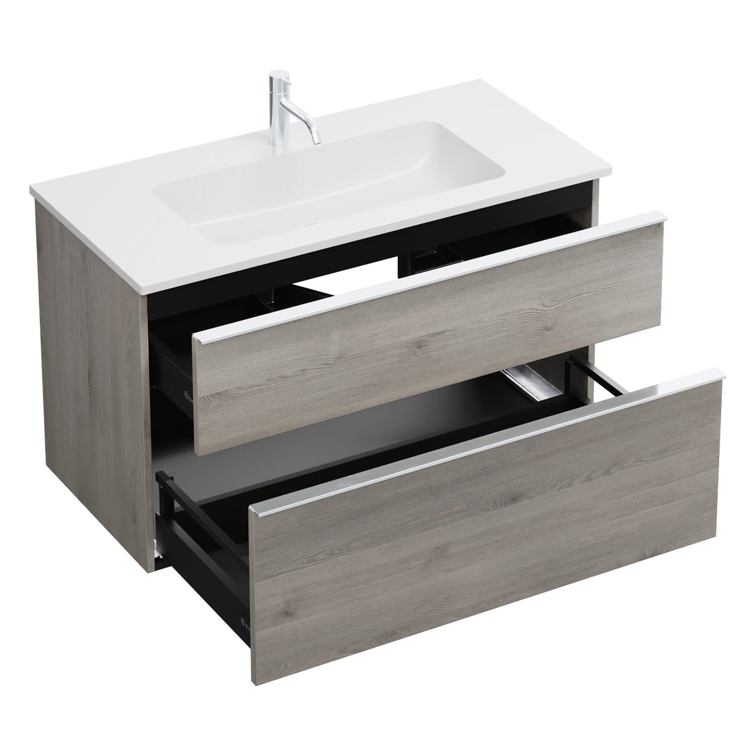 - 1 Schublade oben, 35 cm tief, mit Siphonausschnitt und Inneneinteilung