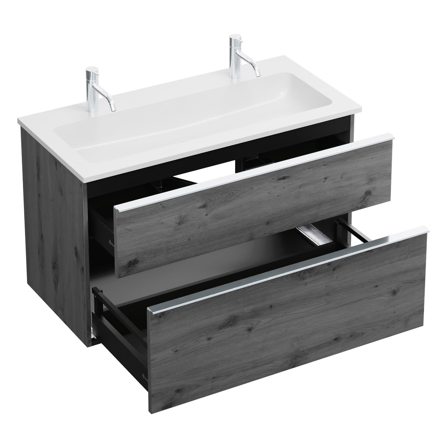 - 1 Schublade oben, 35 cm tief, mit Siphonausschnitt und Inneneinteilung
