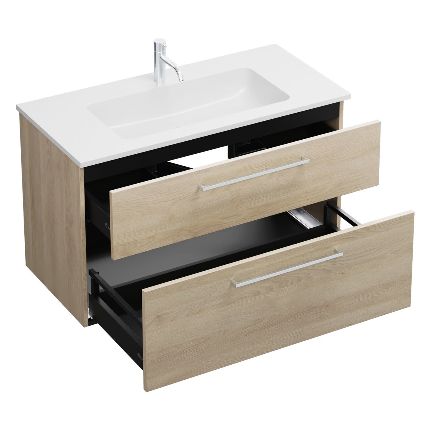 - 1 Schublade oben, 35 cm tief, mit Siphonausschnitt und Inneneinteilung