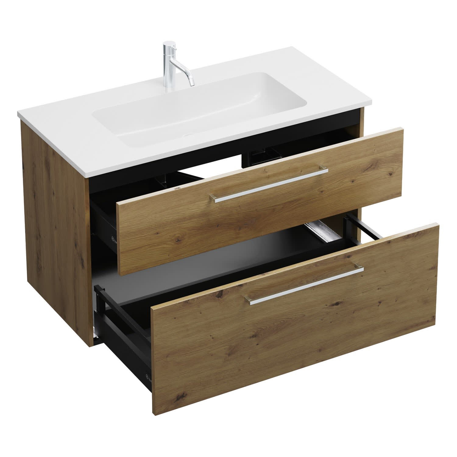 - 1 Schublade oben, 35 cm tief, mit Siphonausschnitt und Inneneinteilung